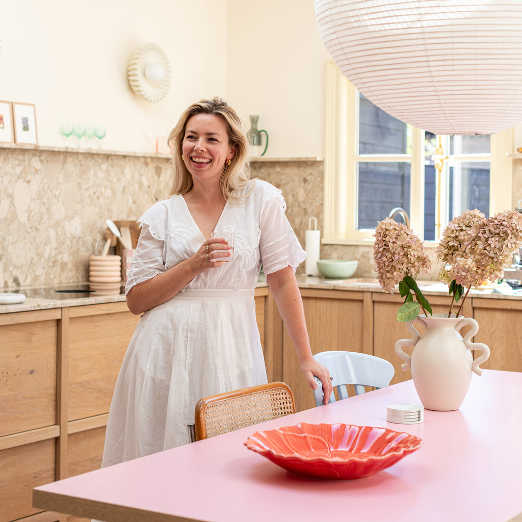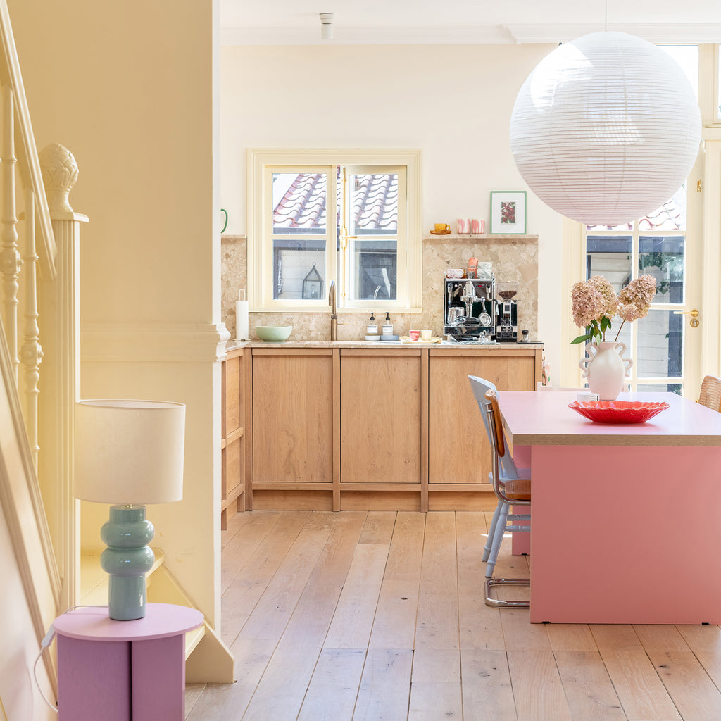 "Voor ons was het altijd al een grote droom om zelf een keuken te kunnen bedenken. We zijn er voor naar Kopenhagen gevlogen en hebben flink onderzoek gedaan naar wat wij mooi vinden. Uiteindelijk hadden we nooit zo ver hoeven zoeken want een vriend van ons heeft onze droomkeuken gebouwd. We wilden graag dat de keuken meteen zou opvallen als je de woonkamer binnen komt. Dat is goed gelukt, zeker met de opvallende roze eettafel van HKliving erbij!"