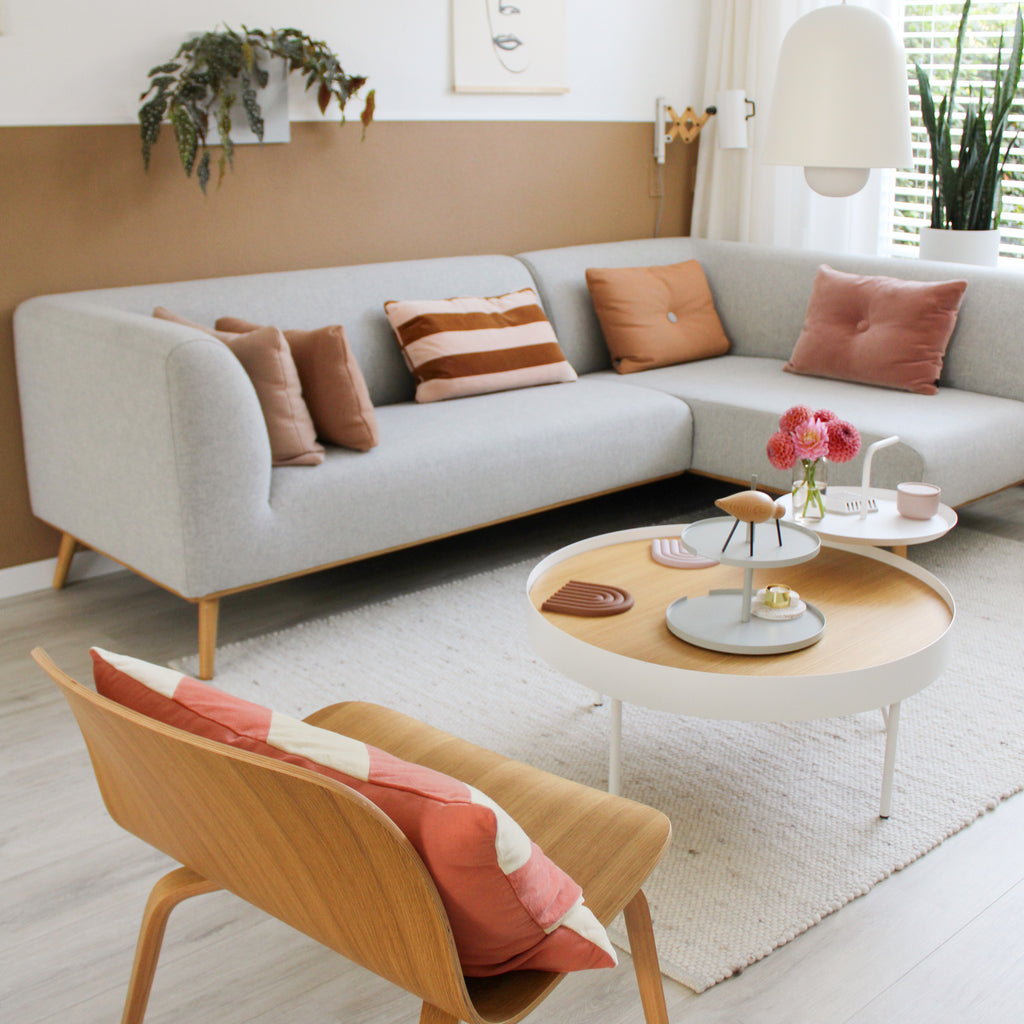 Omdat haar vorige woning weinig warmte en gezelligheid uitstraalde, begon de zoektocht naar een kleurenpalet dat een thuisgevoel gaf. “De stijl die we nu hebben is Scandinavisch, maar wel met een warme touch, wat zorgt voor sfeer.” De basiselementen van een Scandinavisch interieur — lichte, natuurlijke materialen en functioneel design — maken het een minimalistische stijl. Dat hoeft zeker niet saai te zijn, laat Marjolein zien: “Ik ben dol op het toevoegen van aardse tinten: roze, nude, terra, roest of camel zie je veel terug in mijn stijl.” Deze kleuren zie je voornamelijk terug in de accessoires en zorgen voor een fijne, cozy sfeer. Zo heeft ze haar eigen twist gegeven aan de typisch Noordse look.