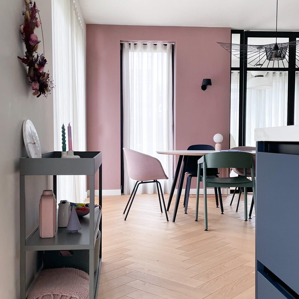 Suzanne creëert eenheid in huis door vaste basiskleuren als uitgangspunt te nemen in haar brede kleurenpalet. Zo komt het donkerblauw van de keuken, mintgroen van de badkamertegels en het lichtroze op de muur terug door haar hele huis. “Daarbij zorgen kobaltblauwe items voor een fijn contrast zonder dat het te druk wordt. Spannende kleurencombinaties maken je interieur interessant waardoor je er niet snel op uitgekeken raakt", vertelt Suzanne. De gietvloer op de bovenverdieping en de zwarte lijnen van de stalen deuren zijn een moderne tegenhanger in haar zoete interieur.