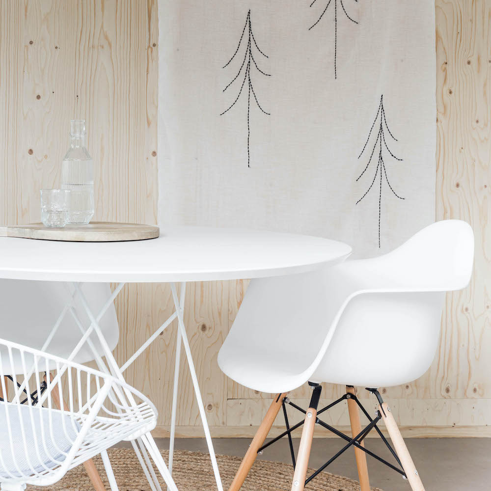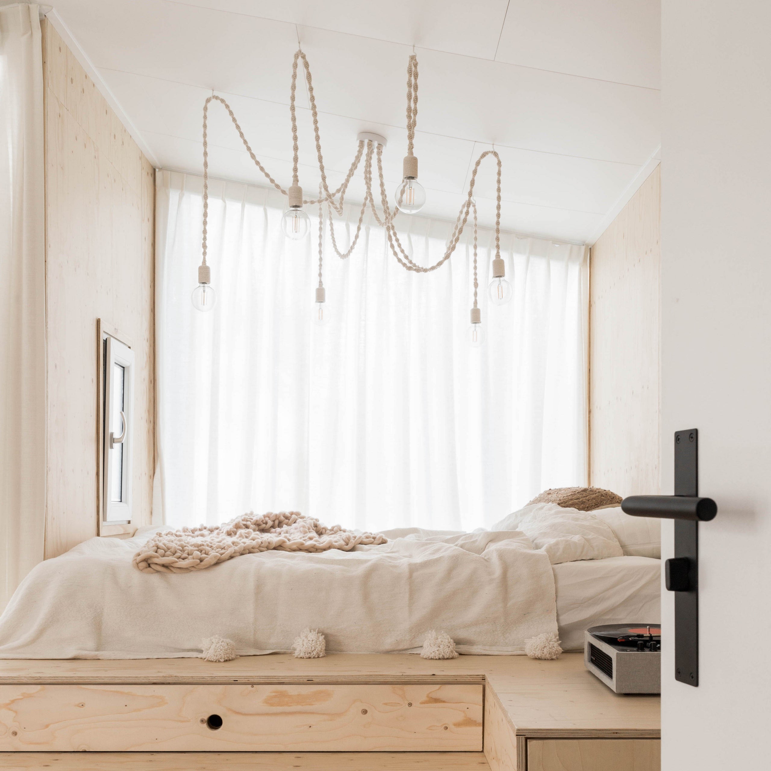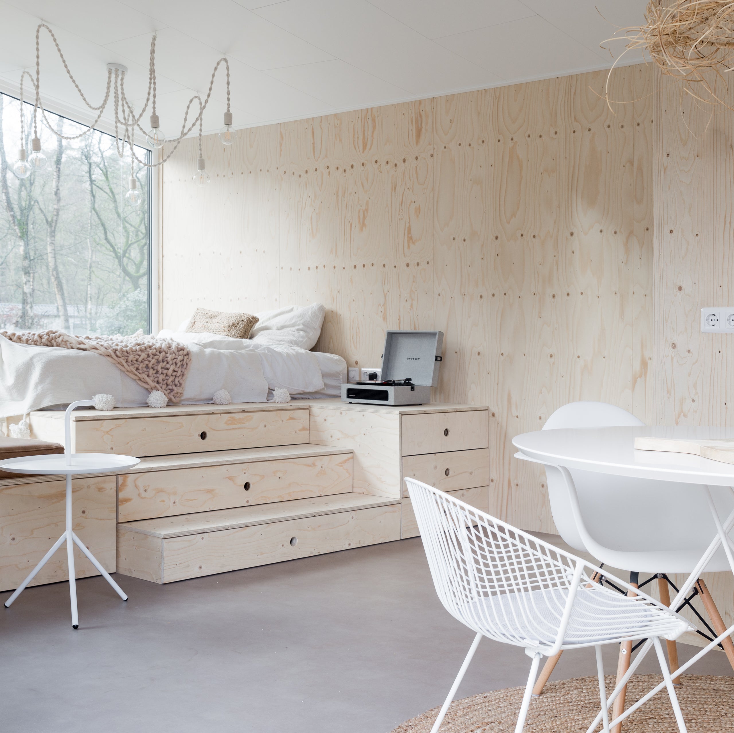 Door de grote, schuine ramen en het verhoogde bed ervaar je het optimale 'bosgevoel' wanneer je in het tiny house verblijft. Het interieur van het tiny house is een lust voor het oog, zeker voor liefhebbers van de Scandinavische woonstijl. Als het aan Nikkie had gelegen was de inrichting helemaal wit geweest, maar voor Marc was dat wel erg extreem en niet praktisch. Ze kozen daarom voor een lichte, Scandinavische basis die rust uitstraalt en voegden licht hout toe om het warm en knus te maken. Om het geheel af te maken werd het tiny house interieur gestyled met typische Scandi meubels, zoals de bekende HAY DLM tafel en witte kuipstoelen