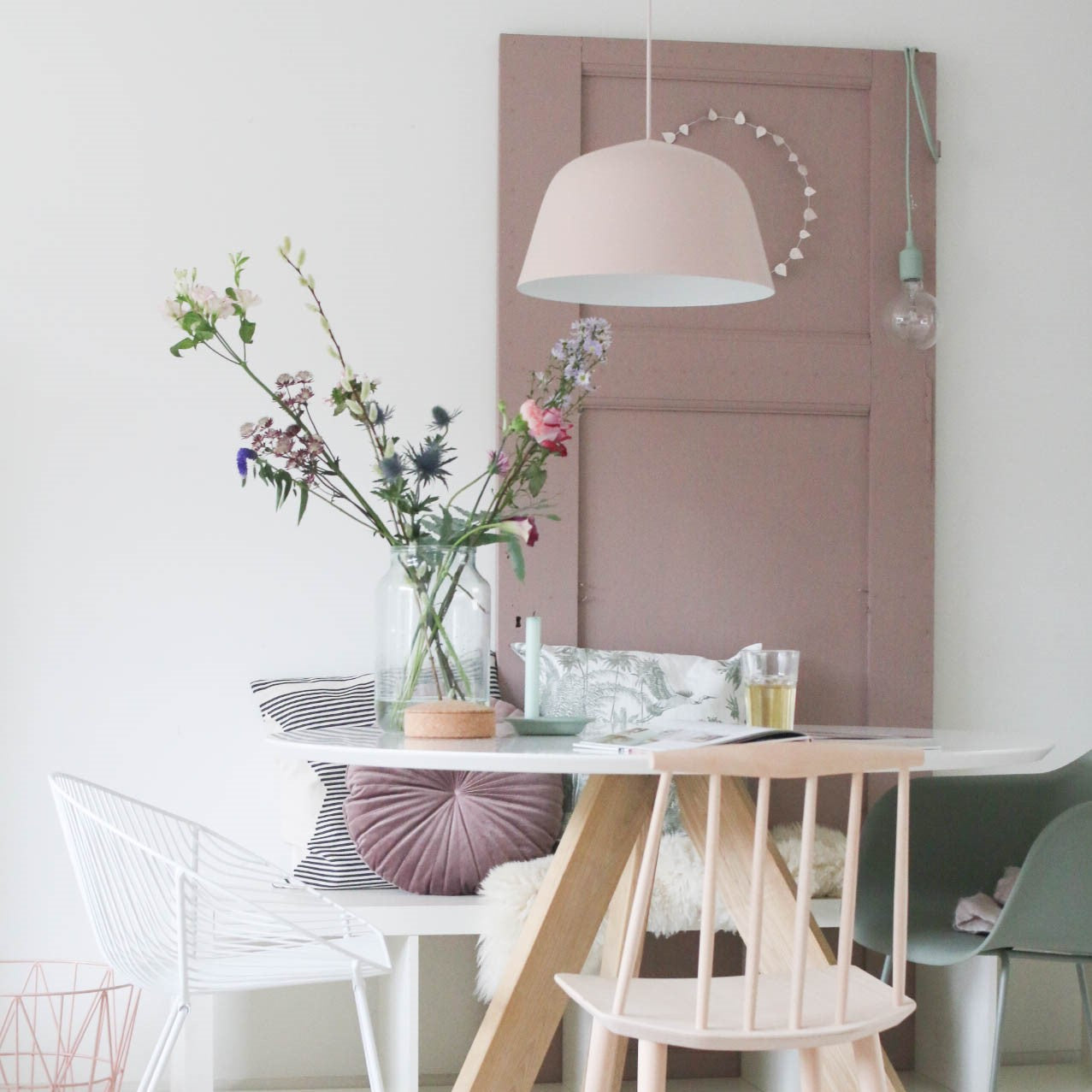 De stijl van Mariët is te omschrijven als een combinatie van Scandinavisch en landelijk. Als favoriete merken noemt ze Muuto, Ferm Living & HAY. "In huis hebben we gekozen voor een lichte basis, waar zachte pasteltinten, design en vintage elkaar ontmoeten. Ik hou er van als kleuren terugkomen in mijn interieur, zodat er een fijne balans ontstaat." Mariët koos voor een lichte basis in haar interieur: de keuken, de vloeren en de muren kregen allemaal een witte kleur.