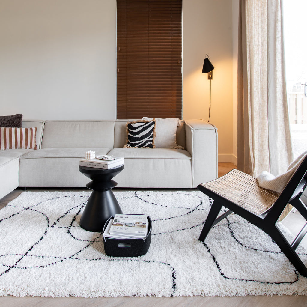 Voordat Greet en Maurice het nieuwbouwhuis in Zwolle kochten, woonden ze in een jaren ’30 woning in Tiel. “In ons vorige huis was onze stijl wat meer in lijn met de sfeer van het huis; fris, licht en Scandinavisch met een boho touch. Dit nieuwbouwhuis werd opgeleverd met mooie donkere kozijnen, dus we wilden die moody sfeer in het interieur terug laten komen. Daarom kozen we hier voor de Japandi stijl, geïnspireerd op en met invloeden van de nieuwe voorjaarstrend Beige Homage gecombineerd met zwarte accenten.”