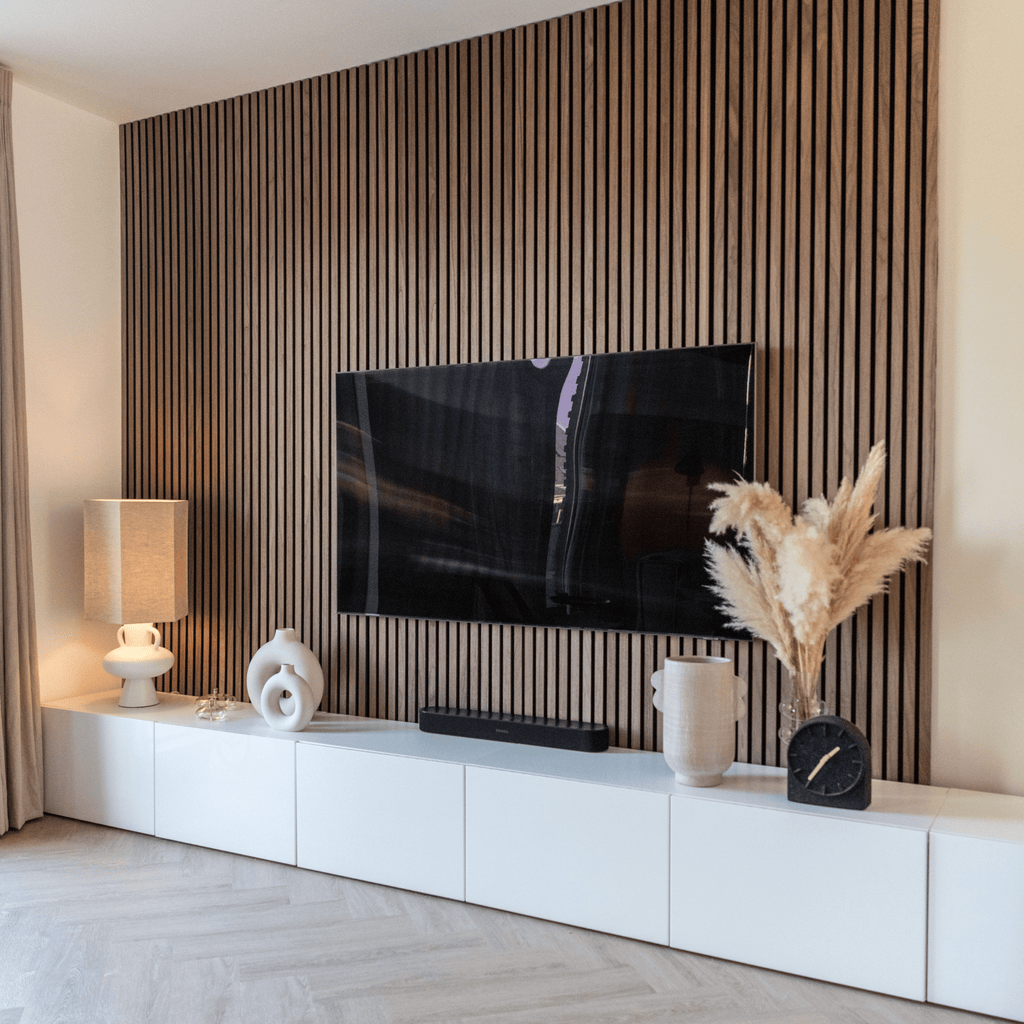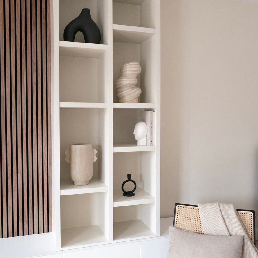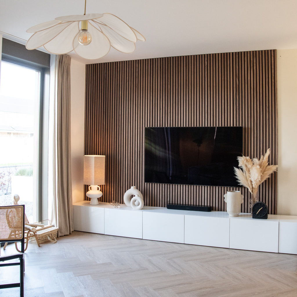 Greet en Maurice vinden het geweldig om zelf aan de slag te gaan met DIY’s voor hun interieur. De woonkamer voelde na de nieuwe indeling en de prachtige lattenwand nog niet helemaal af. “Het voelde nog niet als een geheel. We zijn aan de slag gegaan met een kast die de woonkamer moest scheiden van de zithoek. Ik hoor vaker om me heen dat mensen een lange wand in huis lastig vinden. Door iets groots te plaatsen, zoals zo’n grotere kast of een grote plant baken je de twee ruimtes wat meer af. Deze kast was echt een goede oplossing en zorgt voor een sfeervol geheel van de zithoek.”