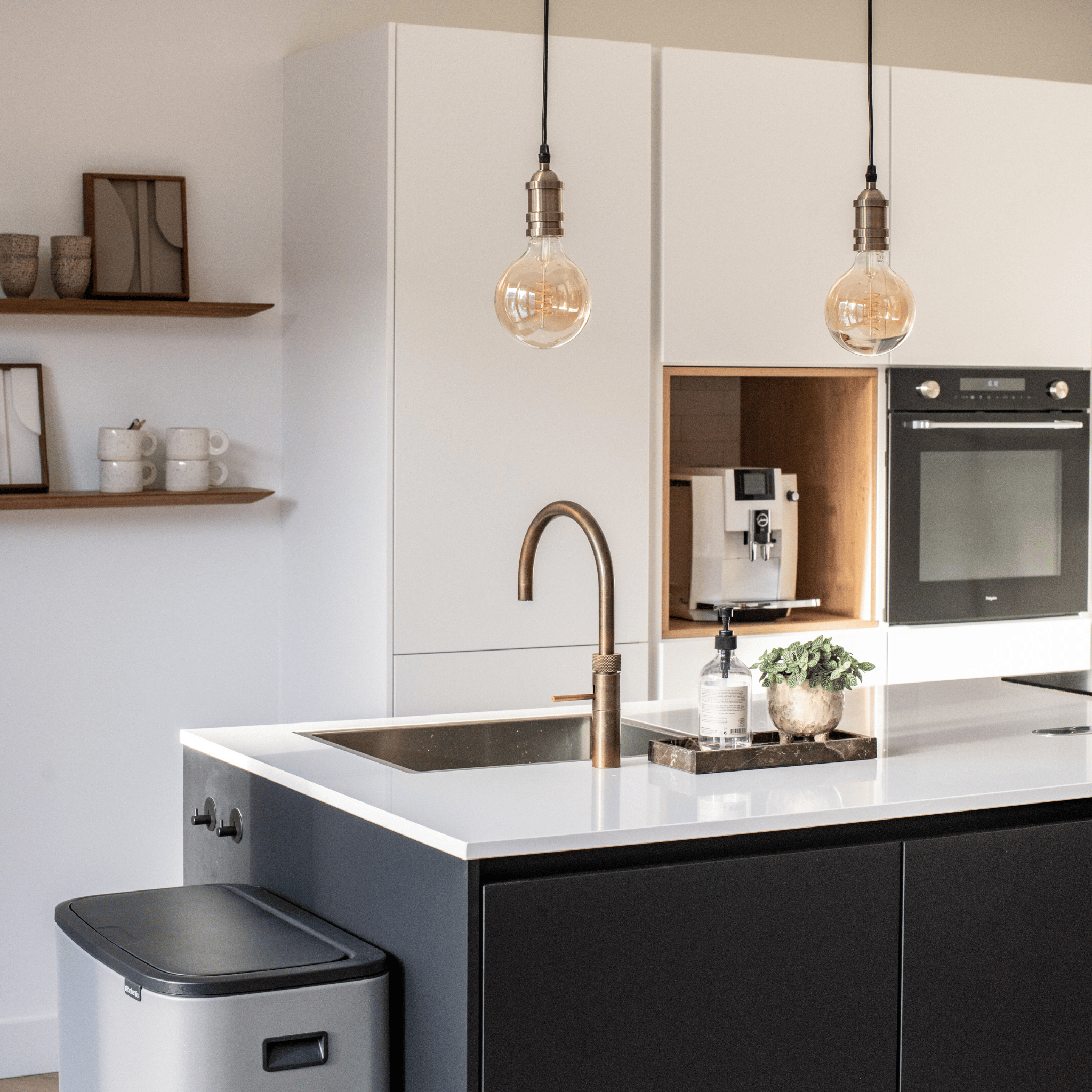Het favoriete plekje van Greet in huis is de woonkamer met de vernieuwde indeling en de lattenwand. “Ik vind het heerlijk om ’s avonds op de bank te kruipen met een kopje thee.” Daarnaast is de keuken echt een plek waar Greet graag is, doordat hij licht en open is. Ze hebben gekozen voor een groot, zwart keukeneiland met een eettafel in dezelfde grootte. "Tijdens de bouw hebben we ruim een meter laten aanbouwen wat zorgt voor extra veel ruimte in de keuken!”