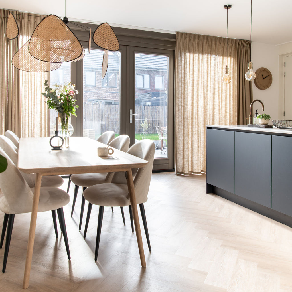 “Toen we het verlossende telefoontje kregen dat dit bouwnummer van ons werd, moesten we snel schakelen. We konden zelf onze keuzes doorgeven voor de keuken, maar we waren er heel snel uit dat we voor een zwarte keuken met een witte achterwand zouden gaan." vertelt Greet. Ze hebben daarnaast bij het inrichten van de woonkamer gekozen voor een rustige basis met een visgraatvloer in combinatie met een zwarte stalen deur, om de donkere kozijnen van het nieuwbouwhuis weer terug te laten komen in het interieur.