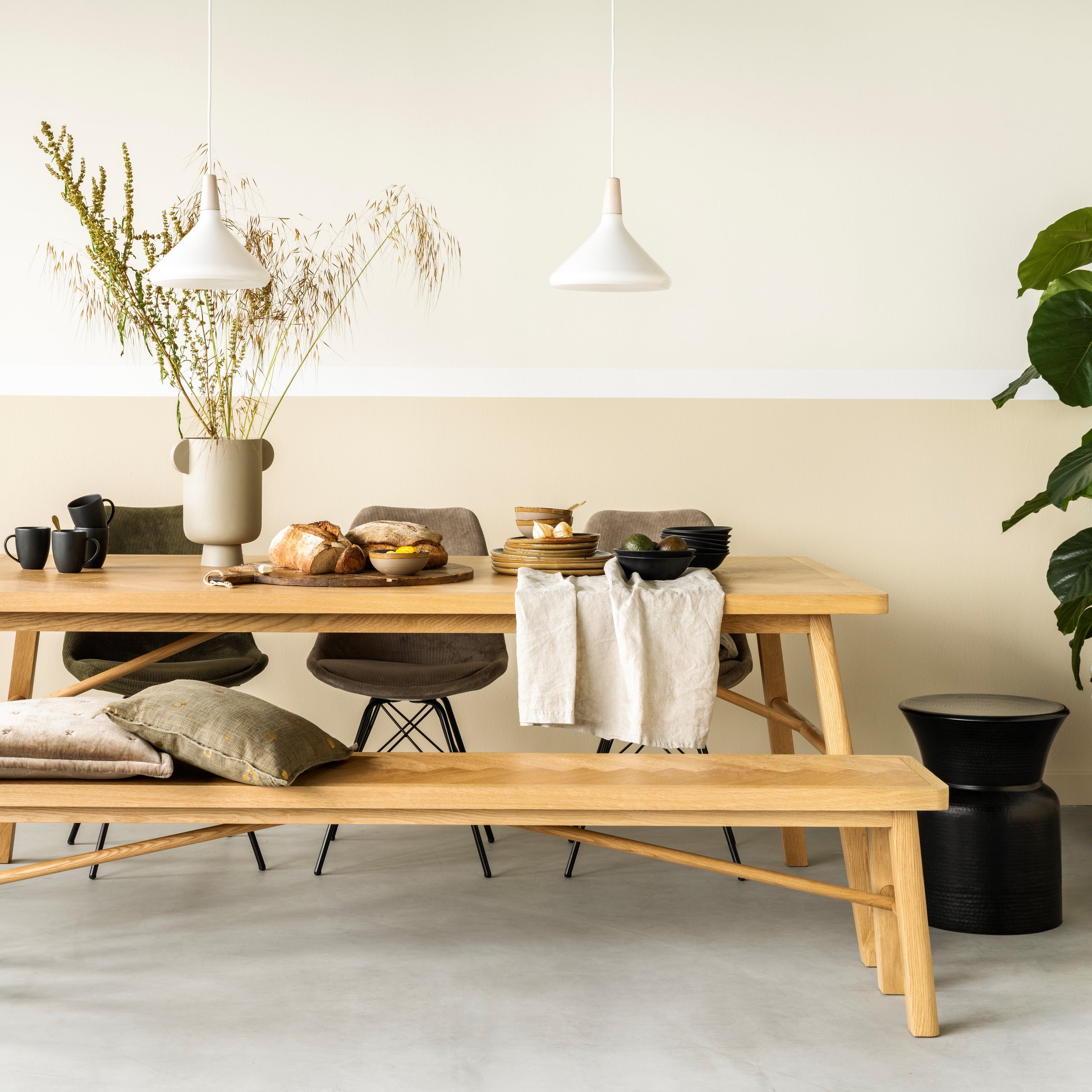 Het voordeel van een eetkamerbankje zonder rugleuning is dat deze een ruimtelijker effect in de eetkamer heeft. Zet je deze tegen de muur? Style hem dan af met leuke sierkussens voor een comfortabele zit én een gezellige sfeer.