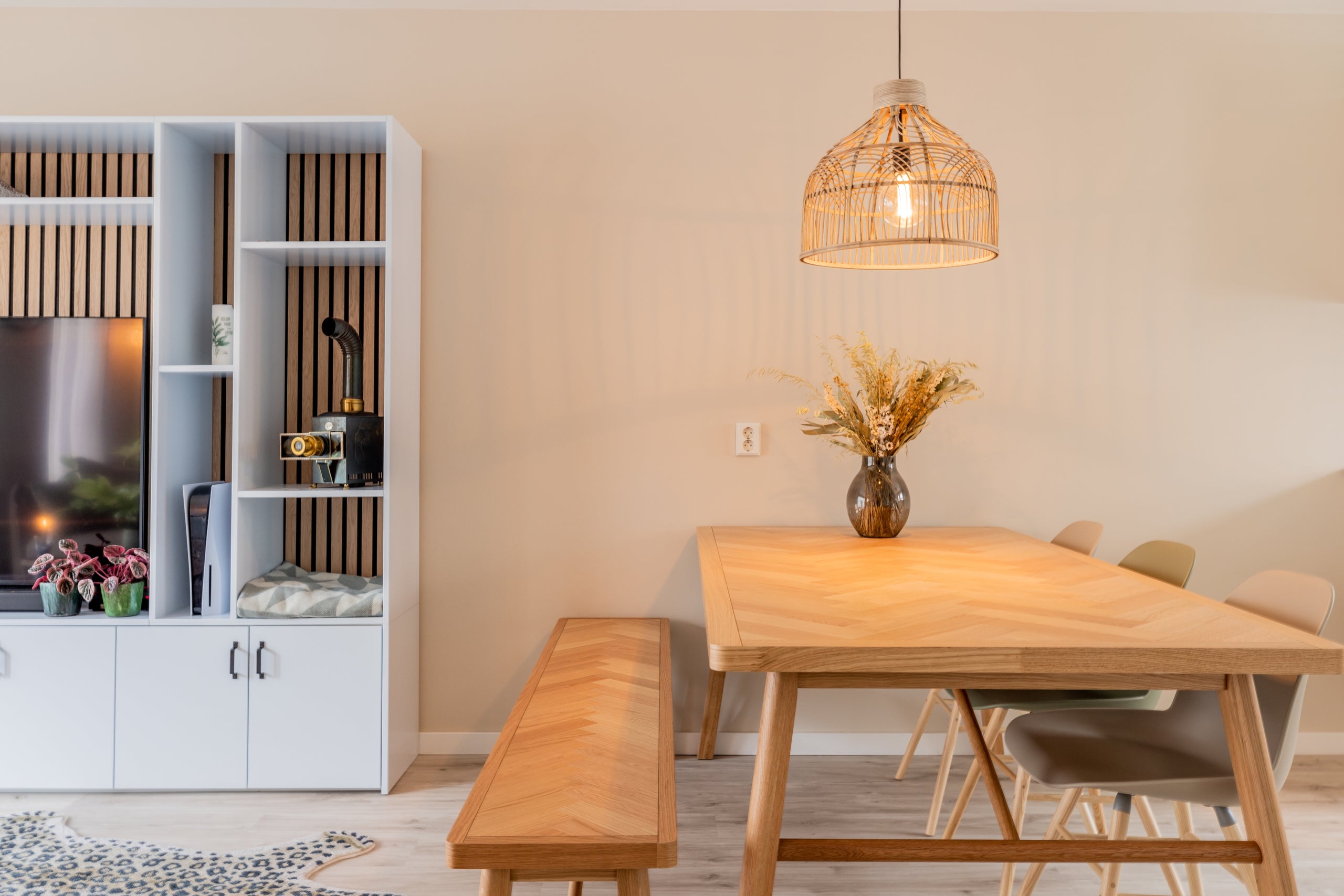 Een eetkamerbank midden in de kamer doorbreekt de ruimte en zorgt voor een mooi statement. Maak je eethoek af met een vloerkleed zodat dit echt een apart gedeelte wordt van de woonkamer.