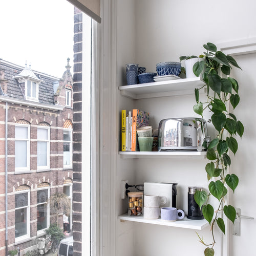De authentieke woning is het perfecte canvas voor haar Scandinavische interieur. "Ik houd van een neutrale basis met veel wit en voeg hier kleur aan toe door te experimenteren met accessoires in vrolijke pasteltinten. Denk aan een opvallende vaas, gekleurde kaarsen, of een lampenkap met een bijzonder patroon." Het vele lichtinval en de hoge plafonds maken Kim's woning bijzonder. Door de vele karakteristieke elementen voelt het als een knus, maar modern stadsappartement. En dankzij de hoge ligging schijnt vaak de zon naar binnen. De erker is dan ook haar favoriete plek in huis.