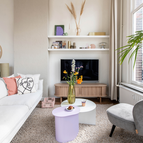De bank staat dwars in de kamer waardoor je fijn wegkijkt over het centrum van Den Bosch. Ook breekt het de ruimte in meerdere gezellige hoekjes; van coffee corner tot eetkamer. Kim heeft gekozen voor meubelstukken die op pootjes staan, waardoor ze een ruimtelijk effect creert en de woning optimaal benut. Haar slimme indeling maakt dat Kim genoeg ruimte heeft voor sfeervolle woonaccessoires. "Ik vind het belangrijk dat ik blij word van mijn interieur. Een aparte lamp of een lila tafel zorgt ervoor dat ik na een lange dag opgewekt mijn huis binnen stap."