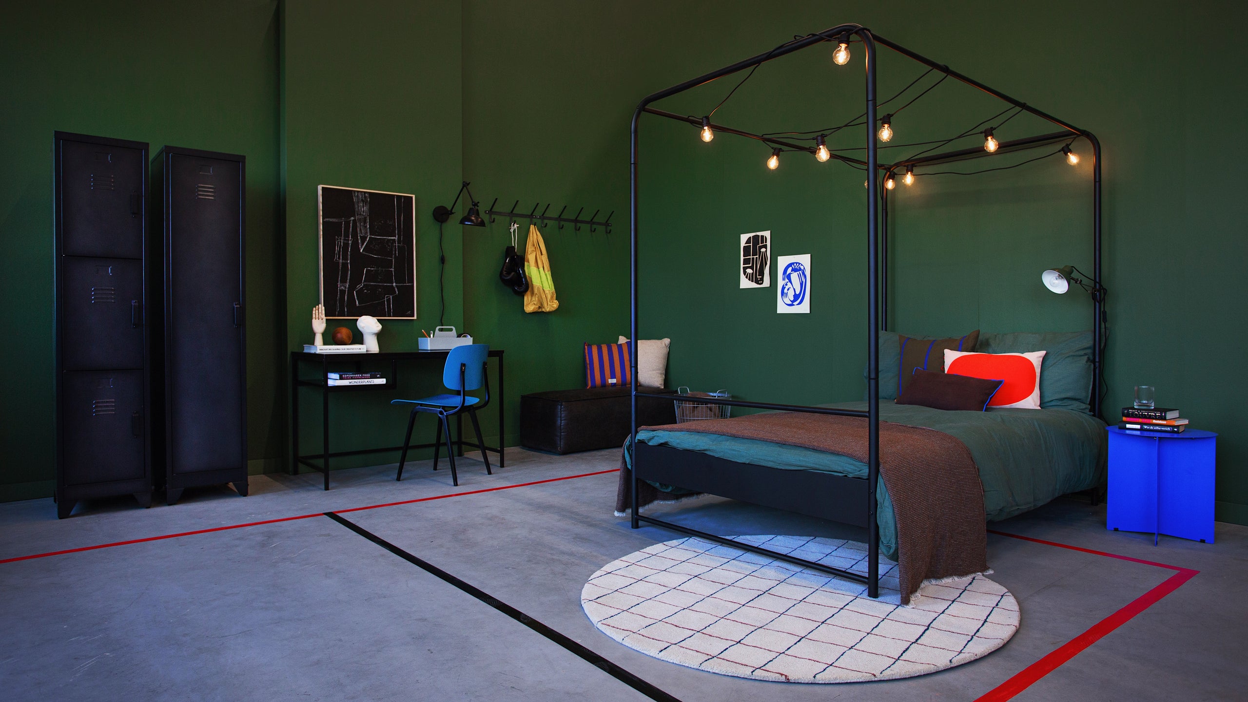 Een industriële stijl is ideaal als leidraad om een stoere tienerkamer in te richten. Denk bij industrieel aan robuuste items en stalen details. Maak gebruik van legergroen, bruin- en grijstinten om een passende look te creëren. In een typische industriële ruimte wordt er weinig gebruik gemaakt van kleur, maar in de tienerkamer mag het allemaal wel wat minder serieus. Voeg knalkleuren toe voor wat contrast. Kies bijvoorbeeld voor accenten in kobaltblauw of fel oranje. Dit laat je terugkomen in kleinere meubels, zoals een nachtkastjebijzettafeltje of in woonaccessoires. Houd je tiener van sport? Dan is het tof om met rood en zwart tape lijnen op de grond te creëren. Zo krijg je het gevoel van een gymzaal!