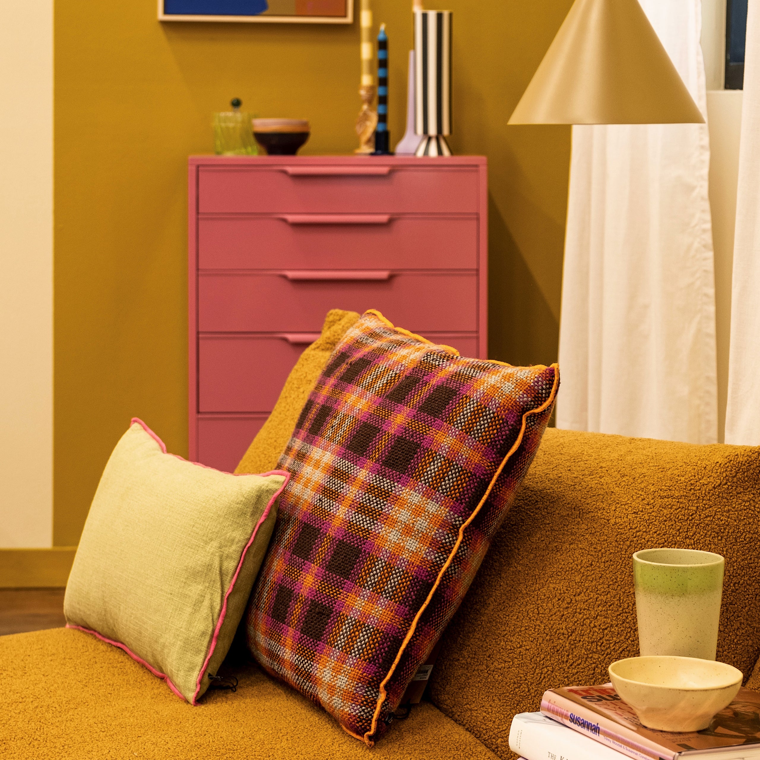 Breng kleur in de ruimte door te werken met textiel in de knalkleuren van de accessoires. Naast verlichting zorgen ook sierkussens voor sfeer. Ga voor grafische patronen en strepen. Voeg als laatst een fijn vloerkleed toe, zo verbind je de verschillende meubels in de kamer én zorgt het ervoor dat de kamer beter geïsoleerd is.
