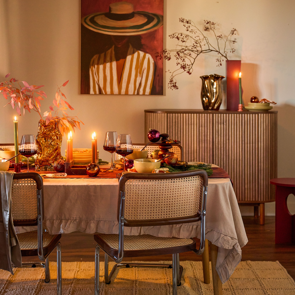 Ga je deze feestdagen voor warmte en sfeer aan tafel, dan past de crafted essentials look perfect bij jou. Deze tafellook draait om diepe tinten, rijke materialen en een gelaagde stijl die direct uitnodigend voelt. Denk aan warme kleuren zoals amber, bordeaux en terracotta, gecombineerd met natuurlijke materialen zoals hout, keramiek en steen. De combinatie van texturen geeft de tafel karakter en maakt de sfeer warm en cosy. Door verschillende materialen en lagen met elkaar te mixen, ontstaat een rijke uitstraling die toch rustig blijft. Warm, rijk en gelaagd: precies zoals een feesttafel mag zijn.