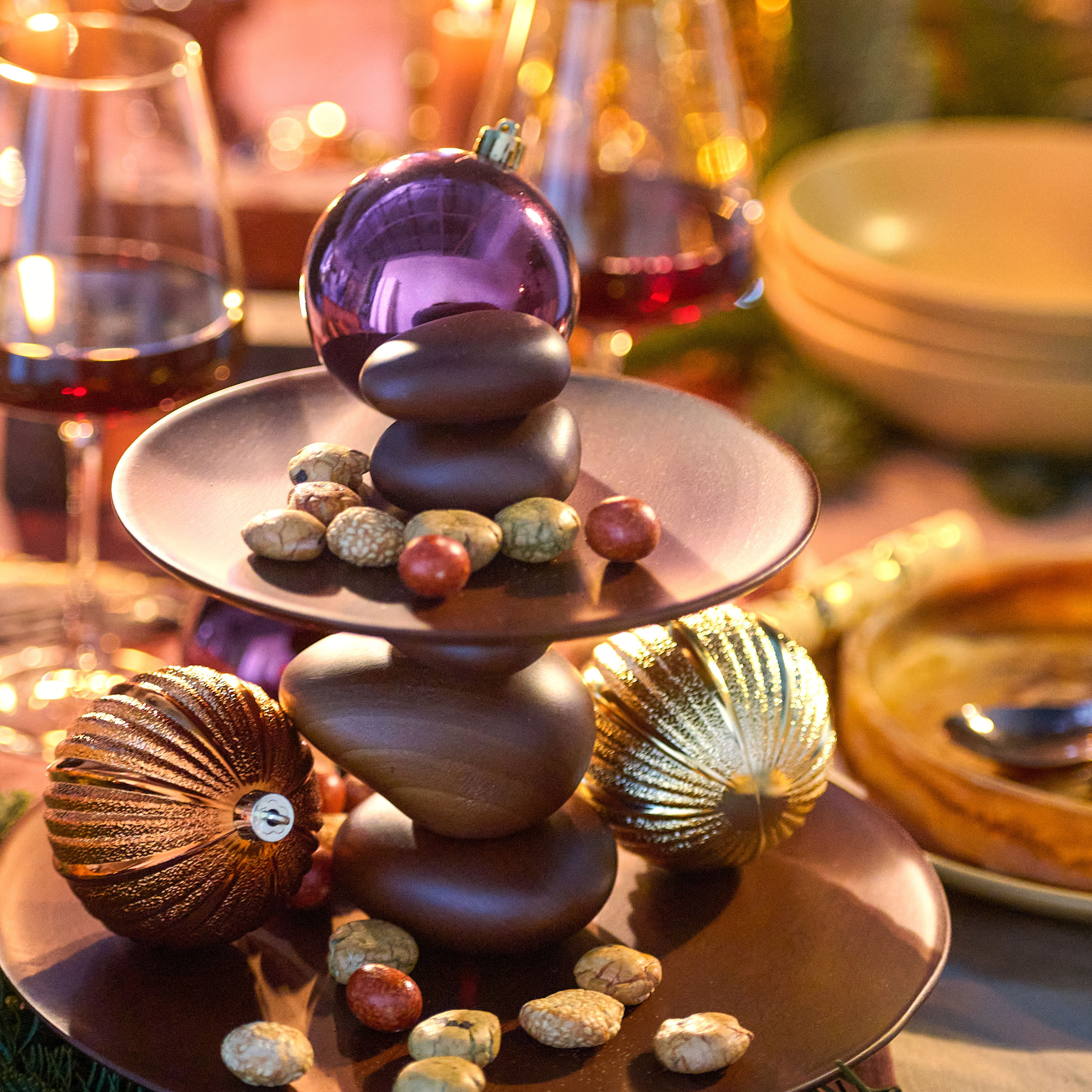 Hout, keramiek, marmer en steen zorgen voor een aardse basis met karakter. De combinatie van deze materialen voelt tactiel en rijk, zonder zwaar te worden. Warm glas in diepe tinten voegt een zachte gloed toe en laat het kaarslicht mooi reflecteren. Het samenspel van matte en glanzende oppervlakken maakt de tafel levendig en eigentijds.