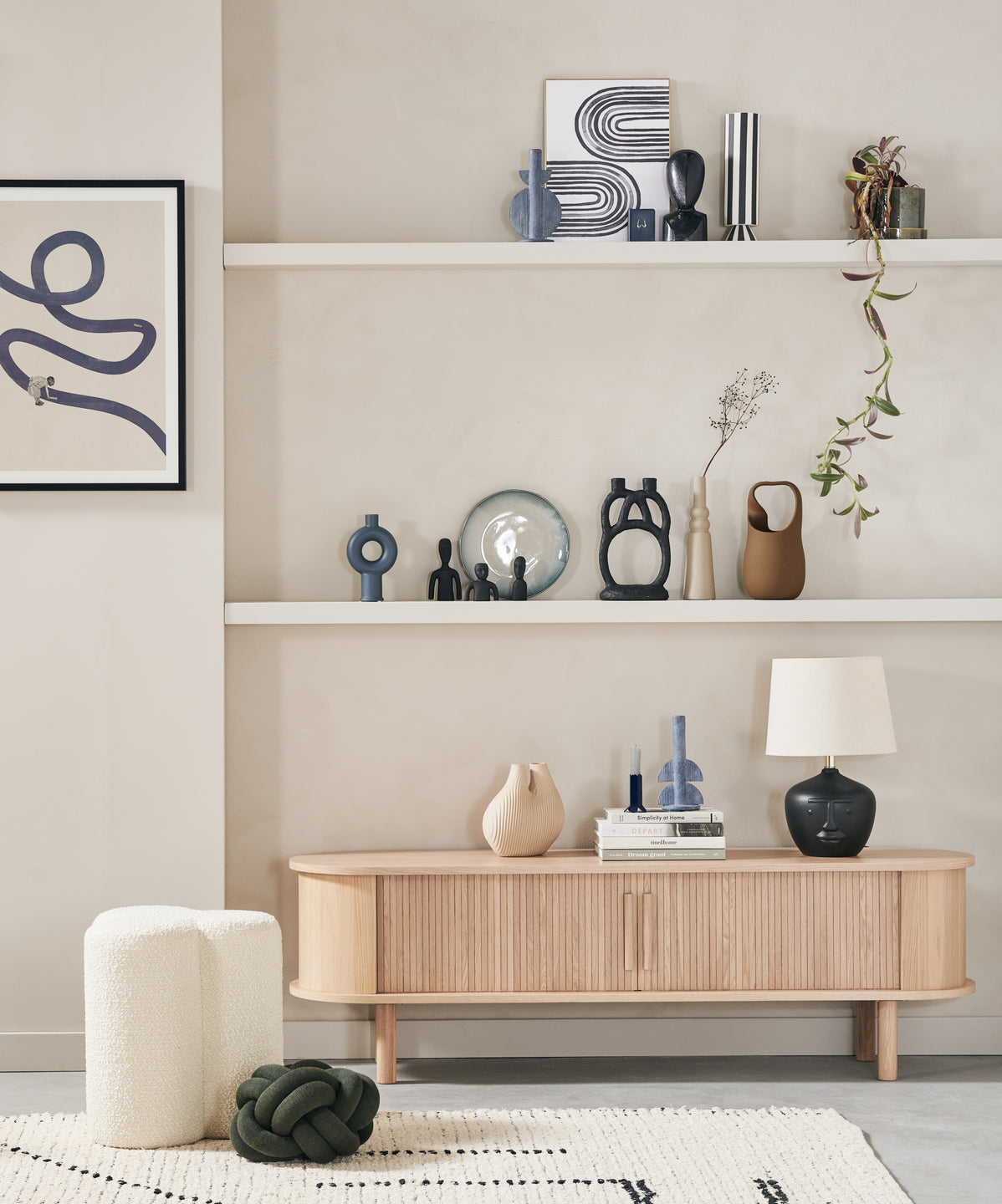 Een minimalistisch interieur hoeft niet per se te bestaan uit moderne kunststof meubels met gladde oppervlaktes. Juist met natuurlijke materialen, zoals hout en steen, breng je rust en warmte in huis; óók in een minimalistisch interieur! Denk aan een houten tv-meubel met mooie nerf of een stenen aanrechtblad in een neutrale kleur.