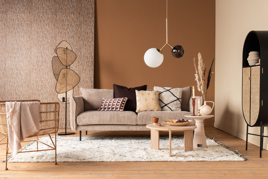 Een sfeervol interieur creëer je door te kiezen voor een warm kleurenpalet met roze en terracotta. Ga voor groots en verf niet één muur, maar alle muren. Door zwarte accenten toe te voegen oogt het geheel strak en krijgt het een volwassen uitsraling. Voeg daarnaast verschillende woonaccessoires in dezelfde tinten toe, zoals een terrazzo bijzettafel. Hiermee creëer je eenheid in de ruimte. Heb je mooie souvenirs of persoonlijke items die je in de spotlight wil zetten? Groepeer deze, zodat het één kunstwerk wordt. Tot slot kan een comfortabele bank in de woonkamer natuurlijk niet ontbreken. Kies een exemplaar met bijpassende hocker. Deze schuif je gemakkelijk bij op een lui avondje Netflixen op de bank.
