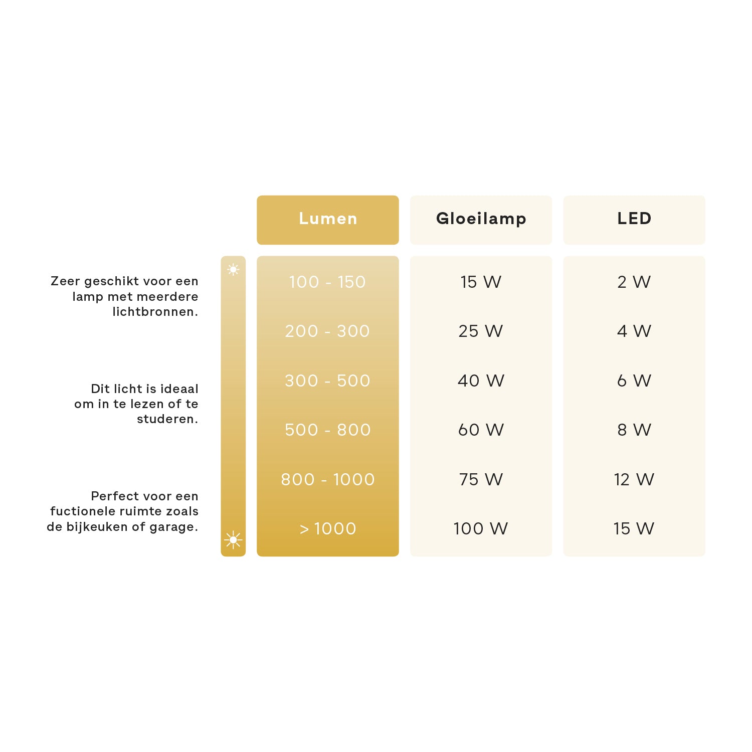 Voorheen gebruikten we voornamelijk wattage om het energieverbruik aan te geven. Met de komst van energiezuinigere spaarlampen, halogeenlampen en LED-lampen zijn lampen tegenwoordig beter te vergelijken op basis van lumen. Hoe hoger het aantal lumen, hoe meer licht de lamp geeft..