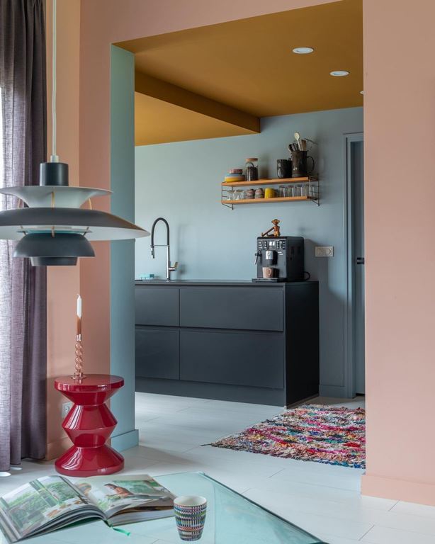 Linda's Scandinavische interieur wordt steeds kleurrijker. Je moet moeite doen om witte muren te vinden, zelfs haar plafonds geeft ze graag een likje verf. Op haar Instagram account @deense_zomer deelt ze de mooiste beelden. Het plafond van de keuken was haar eerste plafond die ze verfde. Sindsdien is ze niet meer te stoppen. Gelukkig maar, want dit maakt haar interieur uniek. De gedurfde kleurcombinaties is wat haar huis bijzonder maakt. De rode bijzettafel bij roze en blauwe muren durft niet iedereen, maar Linda geeft het bewijs dat het gewoon kan!
