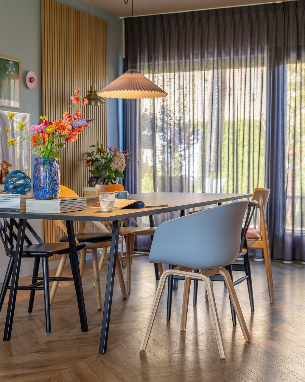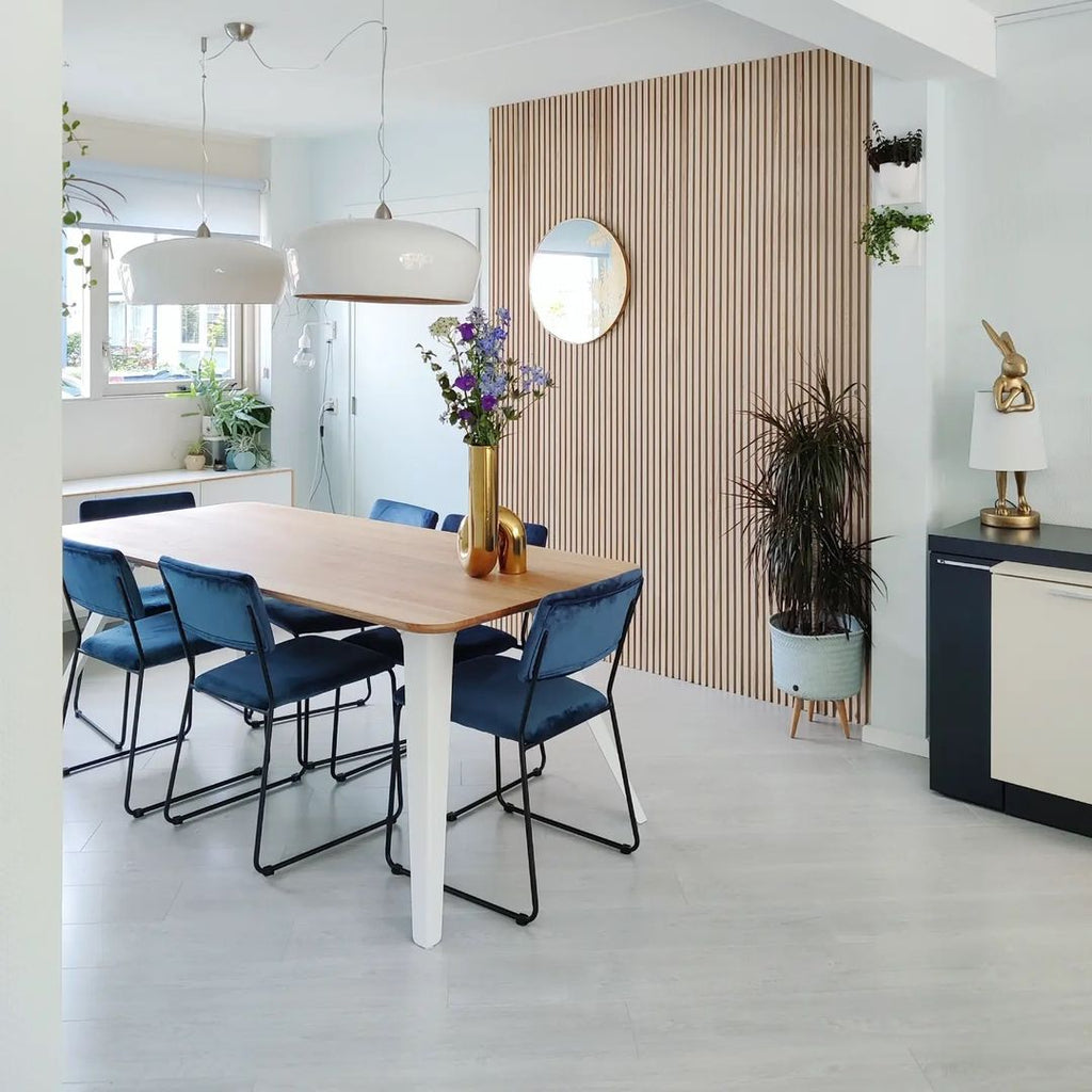 Copy paste in ons interieur graag! Linda van @deense_zomer heeft de prachtige vaas gecombineerd met de geweldige Dusty Blue-eetkamerstoel die deze eetkamer helemaal afmaakt. Het houtwerk en de lijsten aan de wand geven de kamer het laatste stukje perfectie dat het nog nodig had. Hier kan je wel wat gezellige avondjes met vrienden doorbrengen!