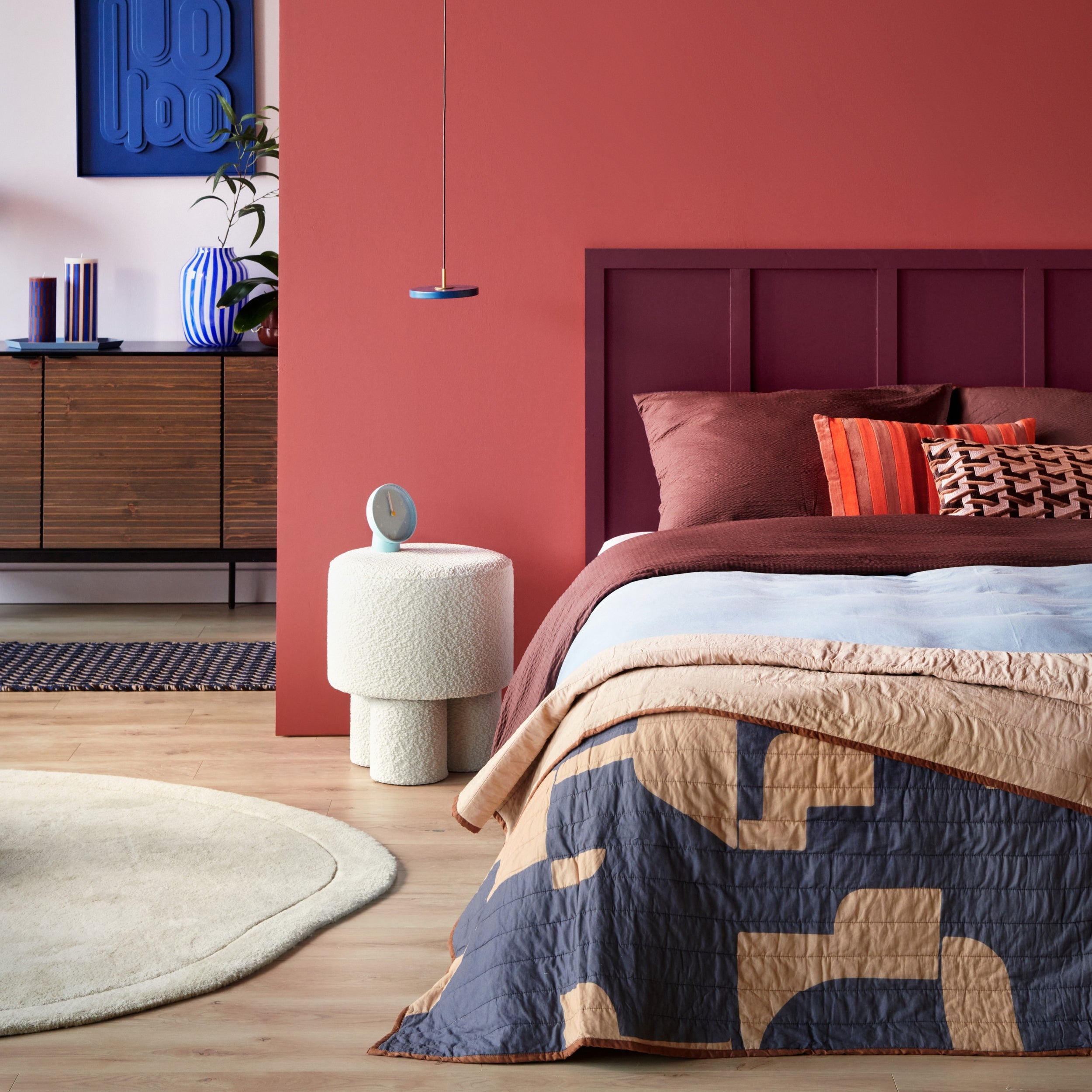 De slaapkamer komt tot leven met het rijke kleurenpalet uit de najaarstrend Privacy Mode. De combinatie van steenrood, zeeblauw en gebroken wit geeft een gevoel van warmte, geborgenheid en klassieke elegantie. Een effen dekbedovertrek in een diepe kleur past goed in deze trend én zorgt voor een knusse en sfeervolle slaapkamer. Gooi een sprei over het bed met een wat drukkere, robuuste print om de look helemaal af te maken.
