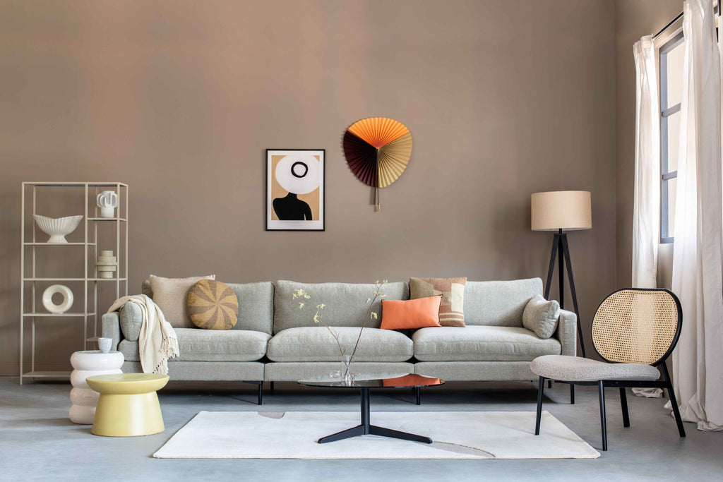 In de Wabi Sabi-trend zie je veel natuurlijke materialen zoals steen, hout, rotan en keramiek terug. Kies bijvoorbeeld voor deze gezellige stoel met een leuning gemaakt van rotan. Met zijn unieke uitstraling trekt hij gegarandeerd de aandacht in je woonkamer. Dit asymmetrische vloerkleed past perfect in een Wabi Sabi-interieur door de verschillende structuren. In een woonkamer mag een comfortabele bank om na een lange dag op neer te ploffen niet ontbreken. Deze heerlijke bank in een subtiele kleur met een hint van olijf is superzacht: niet alleen qua uitstraling, maar de zachtheid voel je ook als je erop ligt!