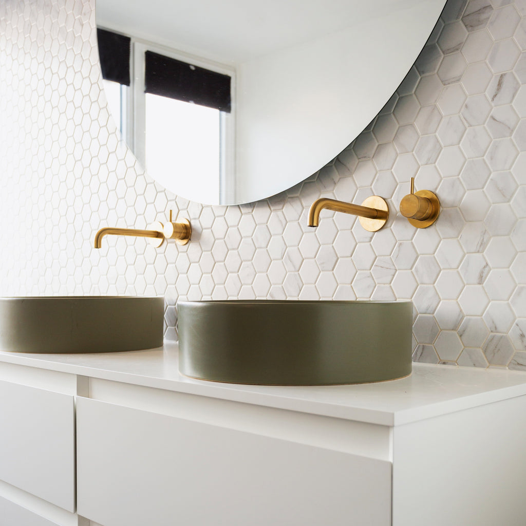 ''Wij hebben bijna alles zelf kunnen doen met hulp van twee handige mannen in de familie, mijn vader en zwager. Eerst was het plan om alleen twee dakkappelen te plaatsen, maar al snel dachten we: als we dan toch bezig zijn, kunnen we gelijk vloerverwarming plaatsen en de hele badkamer aanpakken.'' Danusia wilde gaan voor een hotel chic gevoel in de badkamer. Daarom zien we hier veel groen, messing en grijstinten terug.