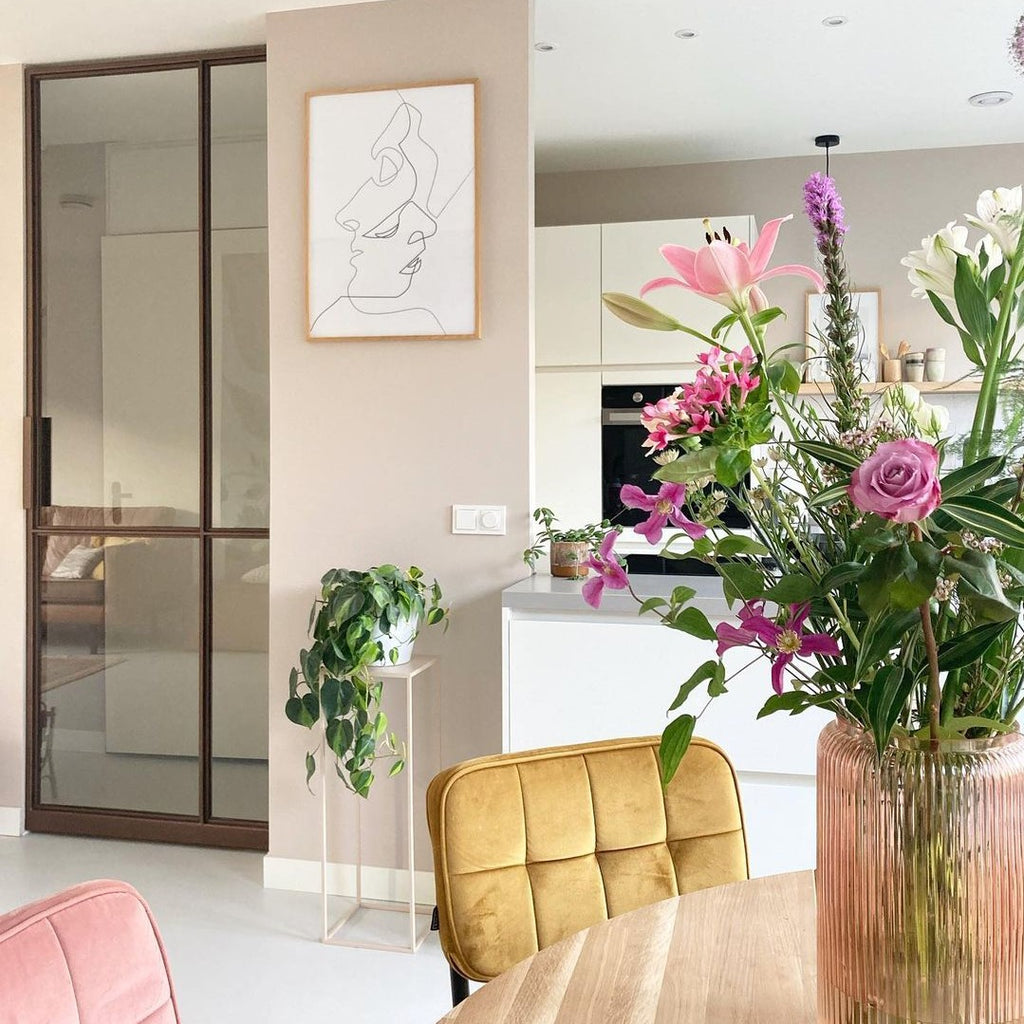 Een rustige Scandi basis met zonnige kleuren wordt opgevuld met unieke eyecatchers, zoals het foto behang met botanische print. Sinds kort is Susanne ook helemaal verliefd op de stalen deur in koperen kleur. “De stalen deur glinstert prachtig als de zon er op schijnt!” aldus Susanne. Merken als Zuiver, HKliving en Bloomingville zijn favoriet, hiervoor heeft Susanne altijd wel een plekje in huis!