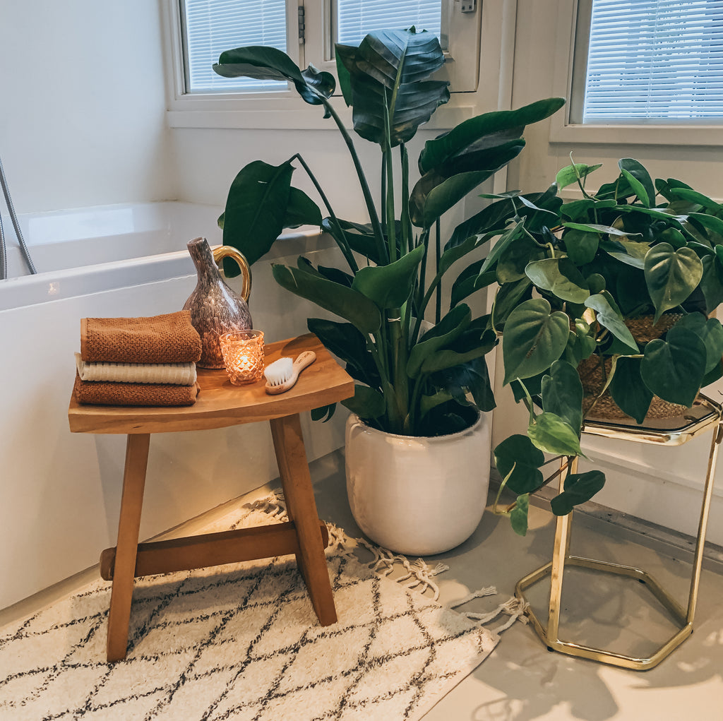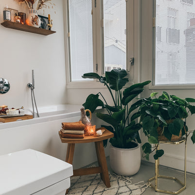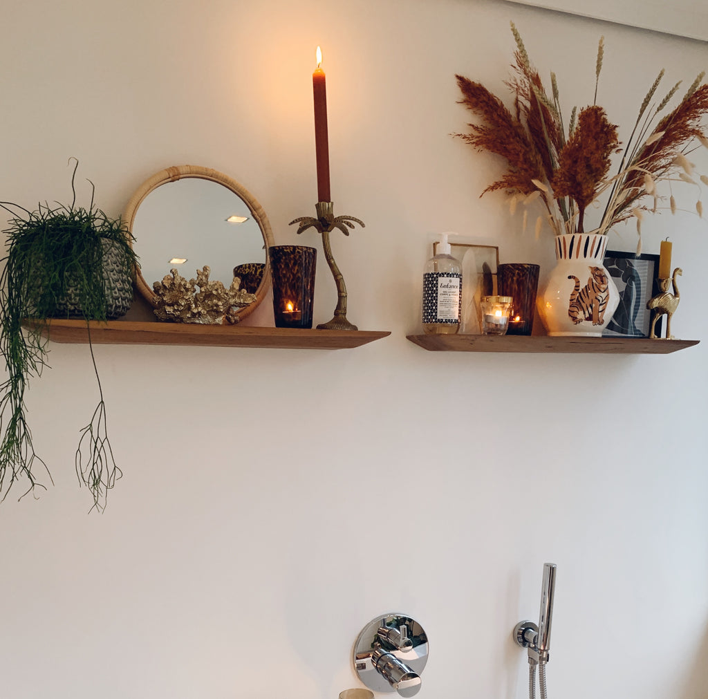Door een kleurenpalet van terracotta en okergeel te combineren met messing en natuurlijke materialen ontstaat er een warme bohemian sfeer. Met hout breek je het geheel en voorkom je dat je witte badkamer een kille uitstraling krijgt. Kies bijvoorbeeld voor een houten wandplankje en kleedt hem aan met een aantal boho woonaccessoires, zoals een gouden kandelaar. Zo maak je een kale, witte muur een stuk gezelliger.