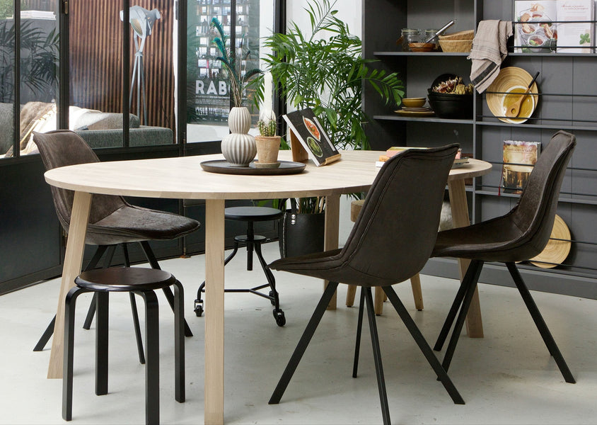 De ronde eettafel staat bekend om zijn praktische imago. Hij is compact, heeft geen hoeken en past daarom beter in een kleine woonkamer. Je kunt daarnaast spelen met verschillende zitmogelijkheden. Zet (verschillende) stoelen rondom of schuif er een comfortabel eetkamerbankje: dit bespaart ruimte én creëert meer zitruimte. Klinkt dat volgens jou ook als een match made in eettafel heaven?