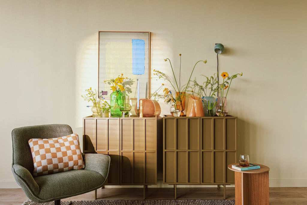 Vrolijk Pasen! Plof neer op je favoriete fauteuil en geniet van het zonnetje in huis. Richt een relaxhoekje in en begin met een rustige, lichte basis met beige- en grijstinten. Kleed je woonkamer aan met vrolijke vazen van gekleurd glas en vul ze met verschillende voorjaarsbloemen of een mooi veldboeket. Kleurrijke woonaccessoires zorgen voor een upgrade. Geen bezoek van vrienden of familie? Besteed je vrije tijd aan het stylen van je dressoir of zet een kop koffie en doe gewoon even lekker niks. Zet een paar stijlvolle kandelaren neer en hang een mooi schilderij of poster op met accenten van pastel voor de finishing touch.