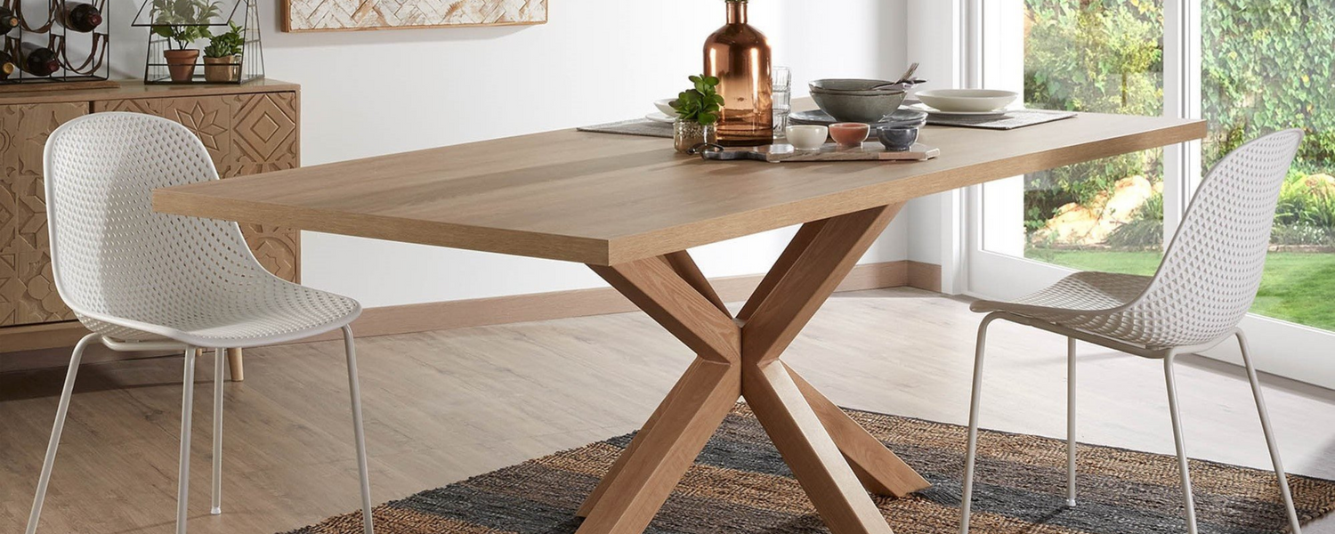 Hoe meer verschillende stoelen aan tafel, des te drukker het oogt. Wil je juist die speelse twist in huis? Combineer dan ook verschillende materiaalsoorten met elkaar zoals hout, kunststof, ijzer, textiel, leer, fluweel of rotan. Houd je niet van felle kleuren? Dan is het mixen van materialen een slimme manier om toch mooie contrasten te creëren. Door verschillende materialen met elkaar te combineren geef je gemakkelijk een andere uitstraling aan jouw eethoek.