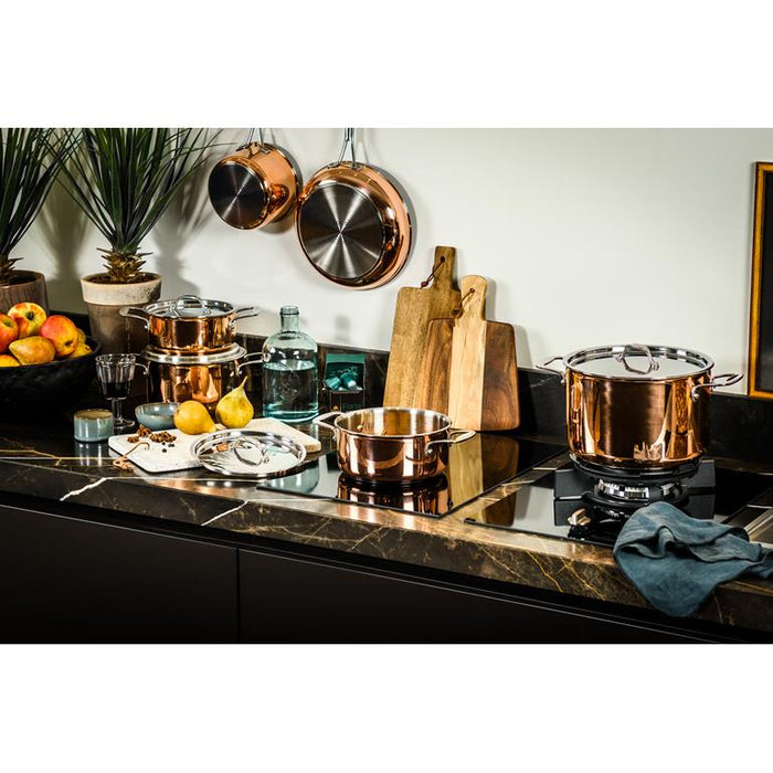Koper is een materiaal dat warmte perfect geleidt; dit maakt een koperen pan perfect om mee te koken. Hij mag dan wat prijzig zijn, maar behandel je een koperen pan met liefde, dan gaat hij een levenlang mee. Wil je niet dat de pan beschadigt? Roer er in met een houten lepel en niet met metalen tools.