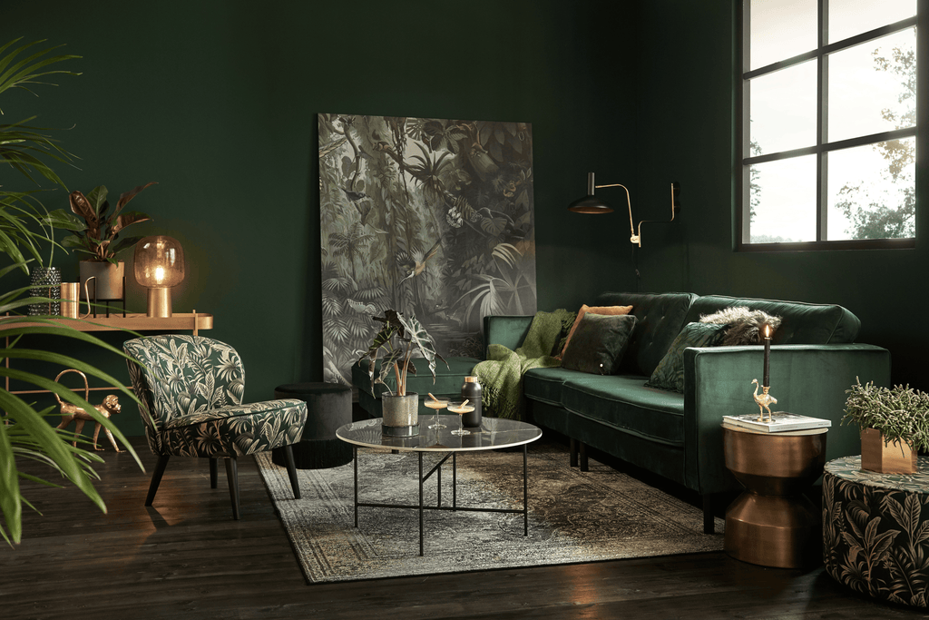 Geef je woonkamer een groene muur, luxe materialen en botanische prints.
