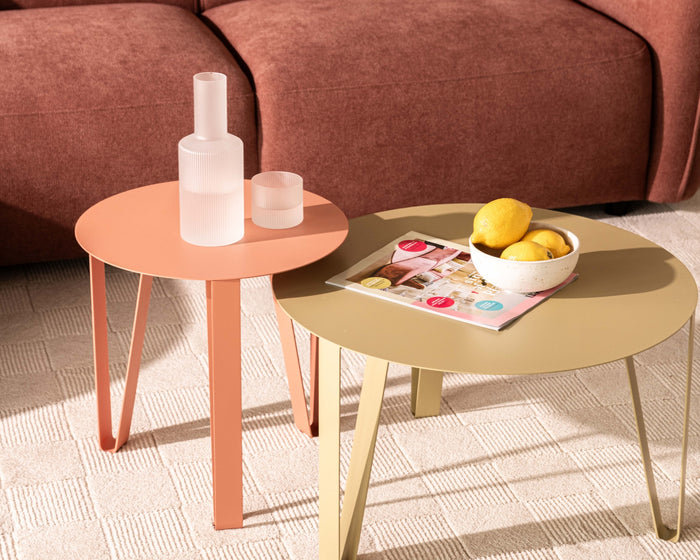 Je kunt zeker allerlei vormen, kleuren en materialen met elkaar in de mix gooien om een levendig interieur te creëren. Wel raden we aan dat er bij alle aparte salontafels in ieder geval één overeenkomst terugkomt. Bijvoorbeeld een tafelblad van hetzelfde materiaal, dezelfde vorm poten of een kleur die terugkomt in een andere salontafel. Zo creëer je toch eenheid en rust in jouw combinatie aan aparte salontafels.