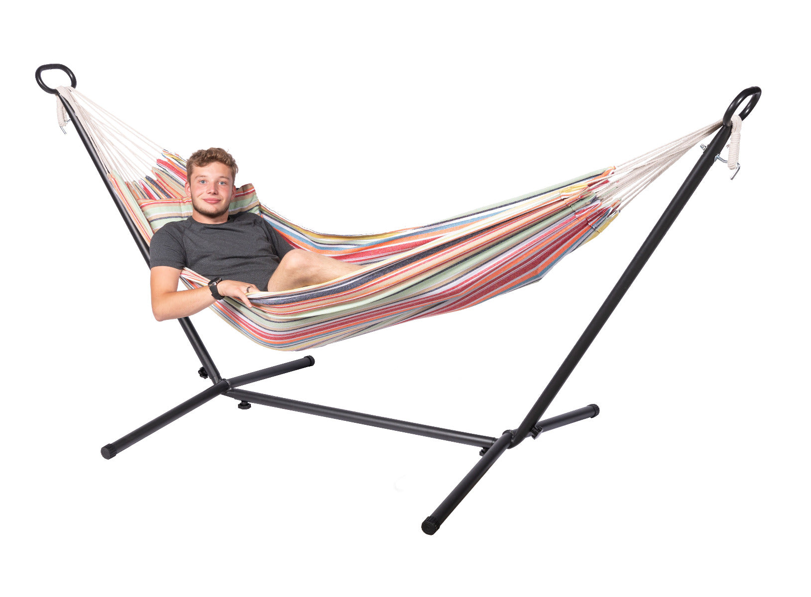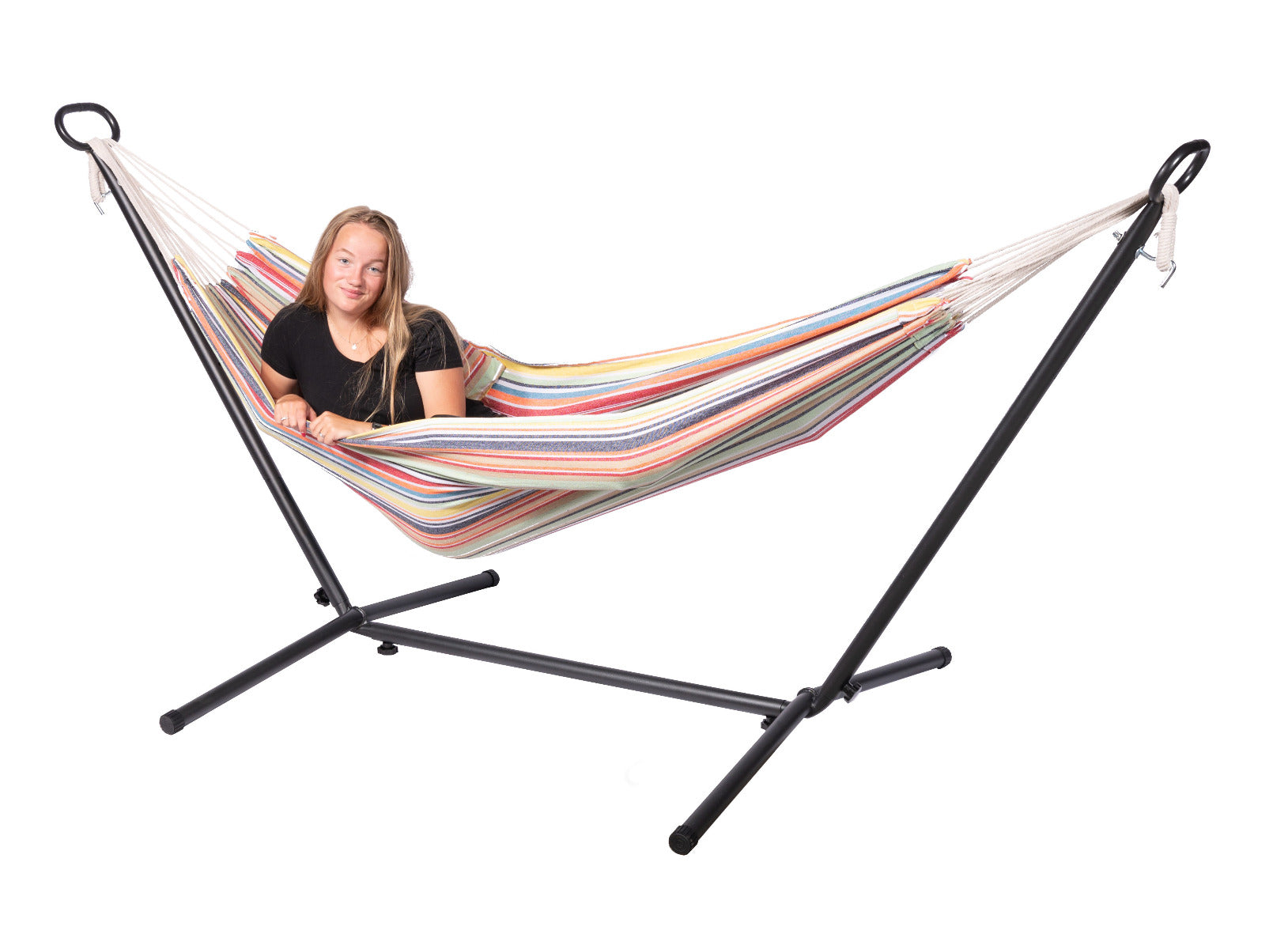 En toch ligt deze hangmat net zo lekker als een hangmat van 100% katoen. Ook zorgt het polyester dat de hangmat minder uitrekt en beter bestand is tegen een regenbui.