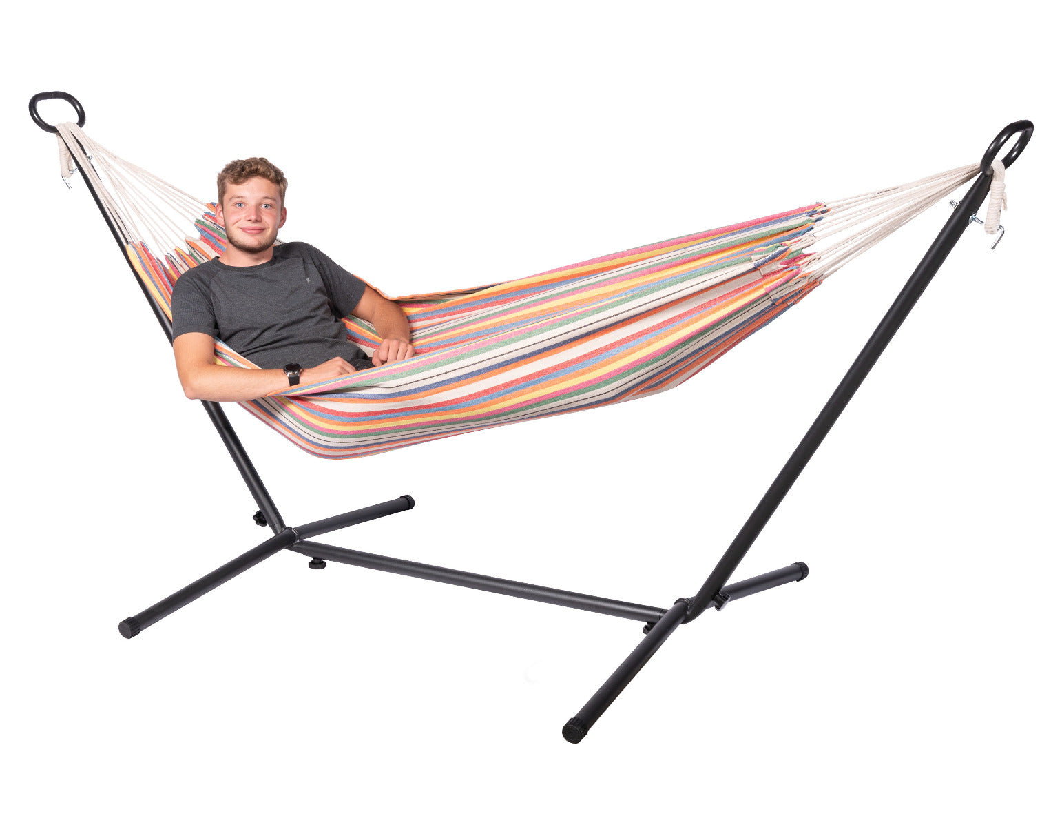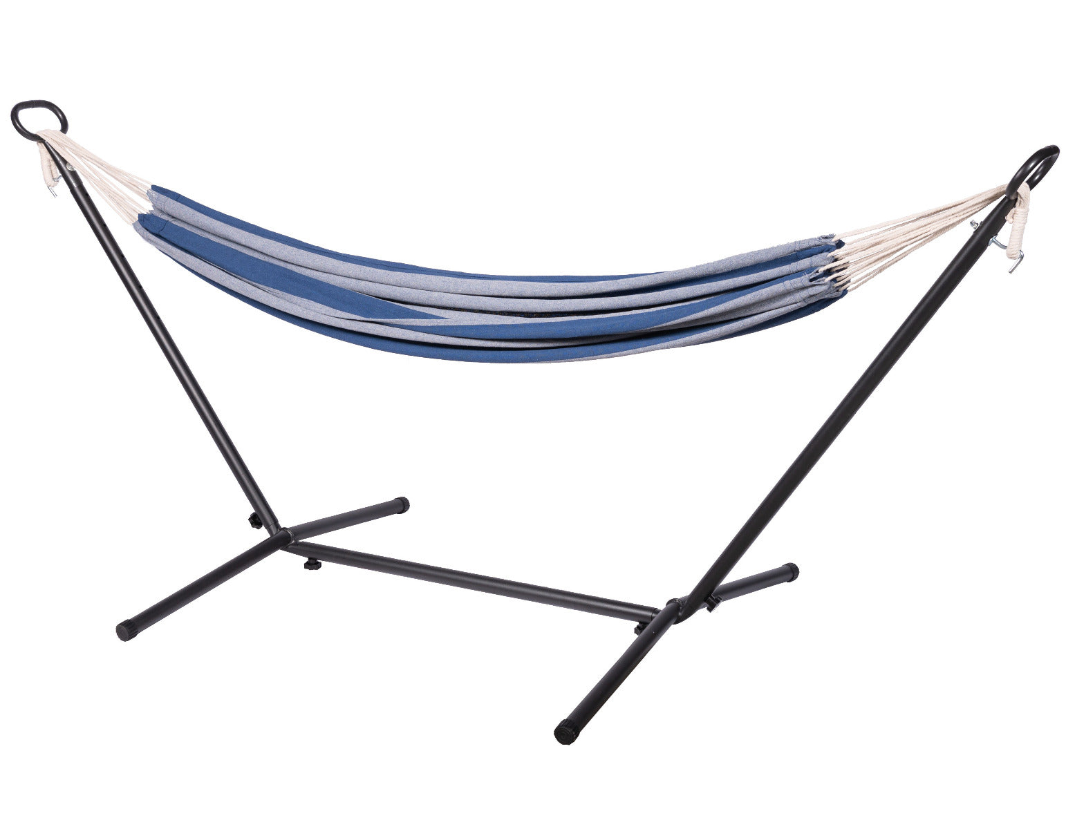 De hangmatstandaard is eenvoudig te verstellen door de haken op een andere hoogte te bevestigen. Zo lig je altijd lekker in je hangmat.