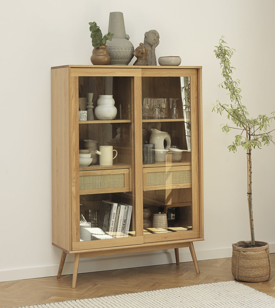 - Materiaal kast: eikenhout, eikenhout fineer, rotan, glas en MDF