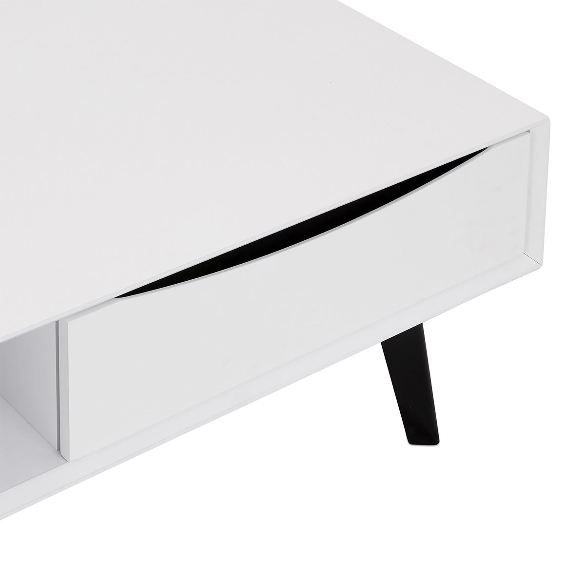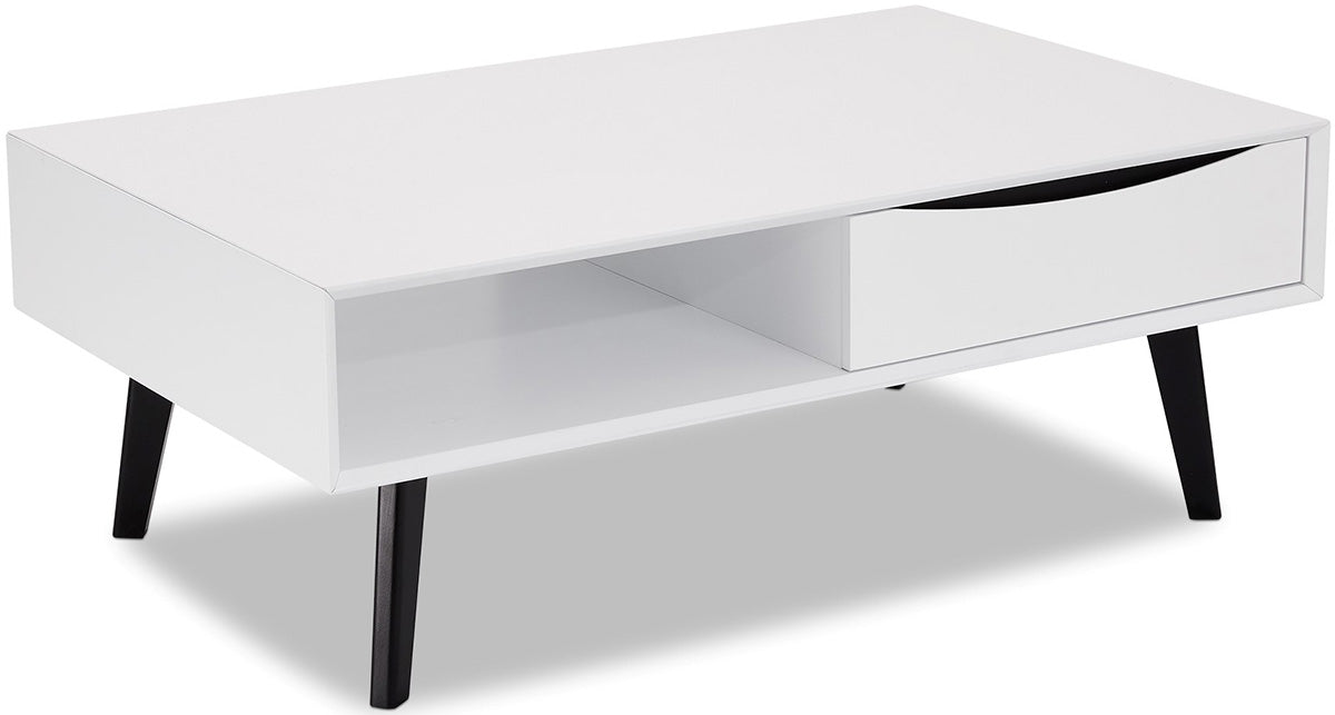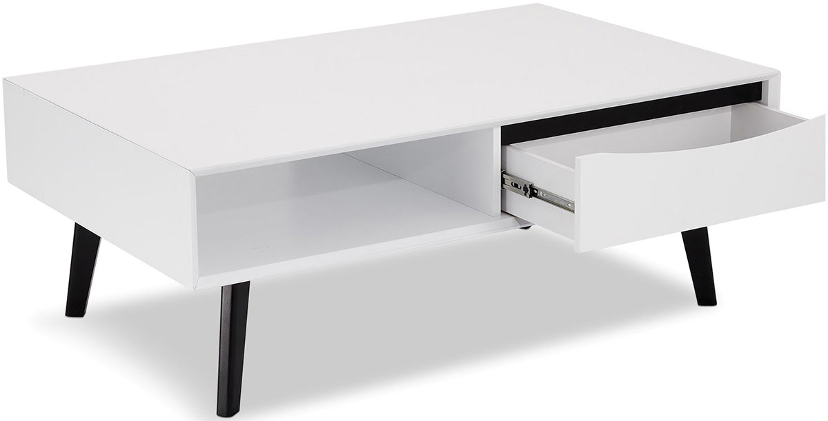 De strak vormgegeven salontafel is geïnspireerd op Scandinavische meubels en heeft een minimalistisch ontwerp In plaats van een ladeknopje heeft de tafel een uitgefreesde handgreep om de lade te openen De donkere uitsnede creëert samen met de zwarte poten een mooi kleurcontrast met de rest van het stijlvolle meubel