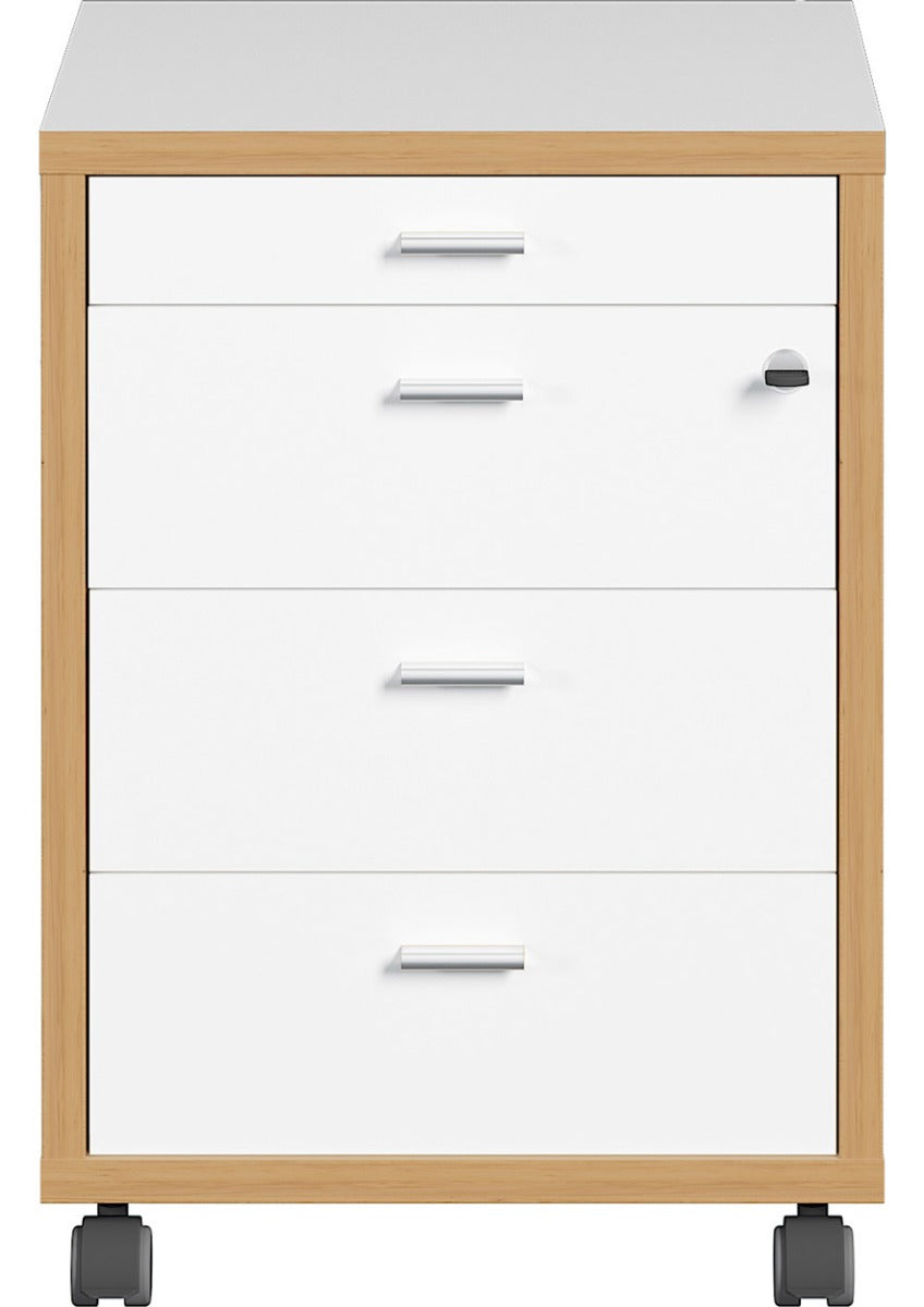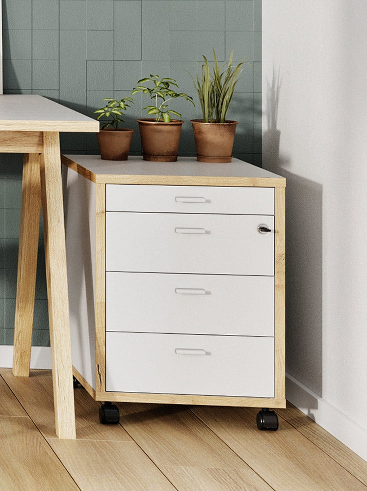 De verrijdbare ladekast heeft vier lades: een kleine en drie grote De tweede lade is afsluitbaar; handig voor het veilig opbergen van belangrijke spullen De ladekast heeft vier praktische wielen waarvan je er twee kunt vergrendelen Daardoor is de kast mobiel én stabiel; als je de ladekast wil verplaatsen haal je gewoon de wielen van het slot!