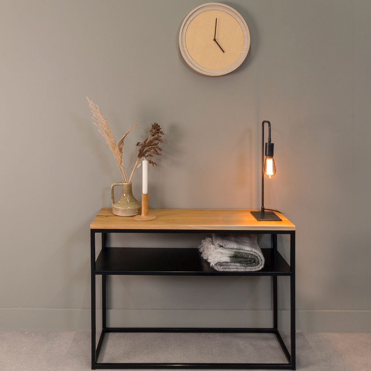 De 24Designs Power sidetable bevat de materialen eikenhout en metaal Deze sterke natuurlijke materialen vormen een industriële en stijlvolle look die in elke woonkamer of hal tot zijn recht komt Dit model van de Power sidetable bevat een lengte/breedte van 100 centimeter en is 70 centimeter hoog Dankzij deze afmetingen is de stoere sidetable erg geschikt om achter de bank of in de hal te plaatsen Bijvoorbeeld tegen een lange wand of onder een grote spiegel De sidetable is uitermate geschikt om je mooiste woonaccessoires op uit te stallen en zo je complete interieur af te stylen
