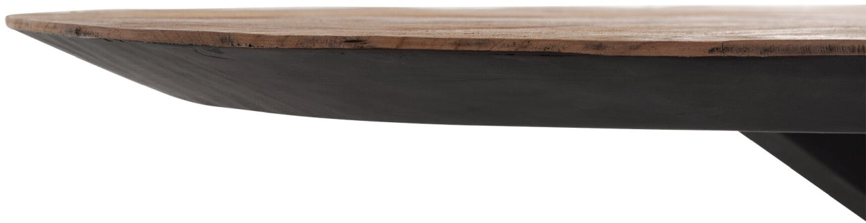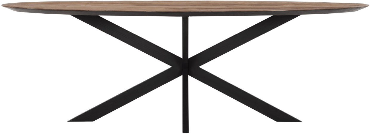 Deze eettafel heeft een robuust tafelblad van gerecycled teakhout en steunt op een stevig design kruisonderstel van metaal Het tafelblad loopt af (verjongd) richting de poten en heeft een zwarte rand
