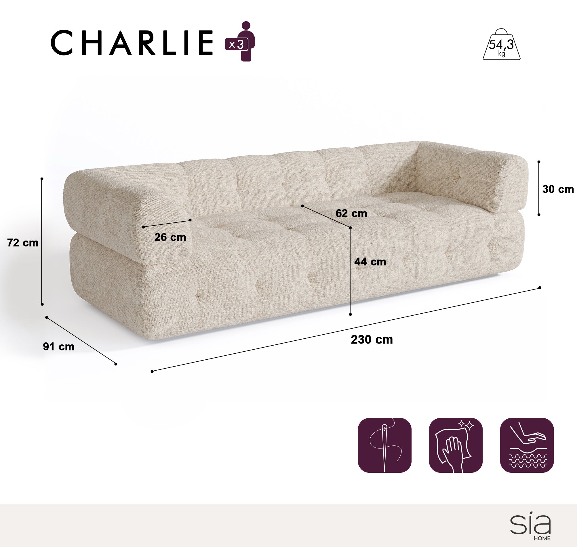 - Zitdiepte : 62cm