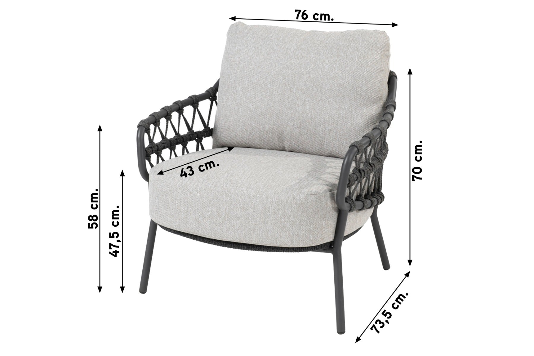 Deze Calpi loungestoel van 4 Seasons Outdoor is gemaakt van RVS en rope. Het RVS is een perfecte basis voor een tuinmeubel. Het materiaal heeft namelijk een lange levensduur en kan niet gaan roesten. Dit frame is onderhoudsvrij, wat ervoor zorgt dat jij je geen zorgen hoeft te maken over deze stoel. Door middel van een poedercoating is de antraciete kleur aangebracht voor uitstraling en bescherming! Het unieke rope patroon van deze stoel is met de hand gevlochten. Het design vind je nergens anders terug! Het donkere antraciet met het lichte grijs steek mooi tegen elkaar af. De meegeleverde kussens zijn ook nog eens weerbestendig. Gemaakt van Olefin stof en een vulling met quick dry foam. De hoezen hebben een rits waardoor je deze ook weer kunt uitwassen wanneer ze vies zijn geworden. Wel raden wij aan de kussens op te bergen wanneer deze niet gebruikt worden, dat verlengt de levensduur!