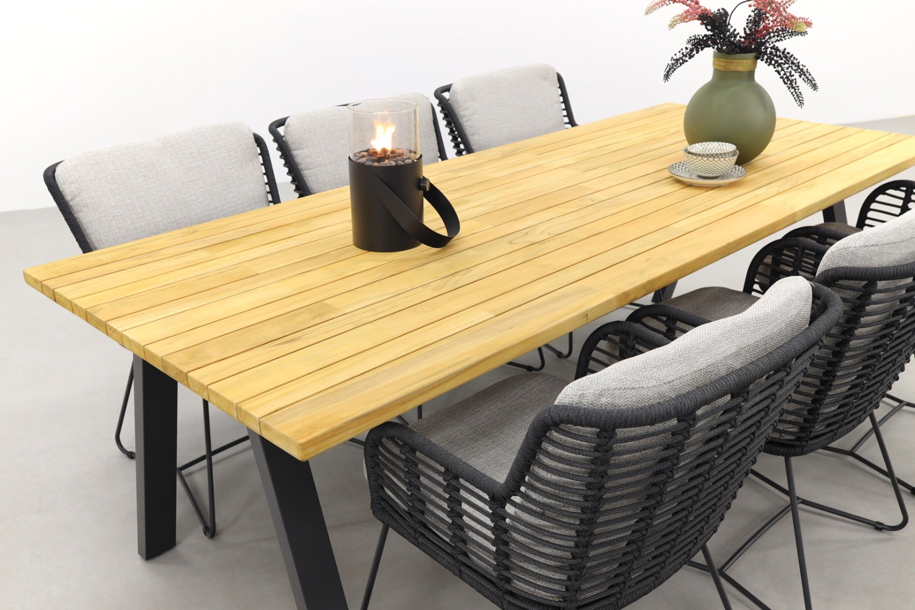 De Ambassador tuintafel van Taste heeft een teakhouten blad. Teak hout is een harde houtsoort en daarmee perfect geschikt voor het gebruik in tuintafels. Teak hout zal na verloop van tijd gaan verkleuren en haarscheurtjes gaan vertonen. Dit is niet erg want het maakt de tafel juist nog stoerder. Mocht je de voorkeur hebben om de originele kleur te behouden van het teak hout. Dan adviseren wij om de tafel te behandelen met een protector. Deze kun je eenvoudig mee bestellen in de voordeelbundel. Om vlekken te voorkomen kun je de teak tafel ook behandelen met een teak shield. Dit onderhoudsmiddel zorgt er tevens voor dat het teak water- en vuilafstotend is. Let op dat je de teak tuintafel nooit afdekt met een hoes. Wanneer het tafelblad volledig afgesloten wordt kan het niet “ademen” en kunnen er lelijke vlekken ontstaan.