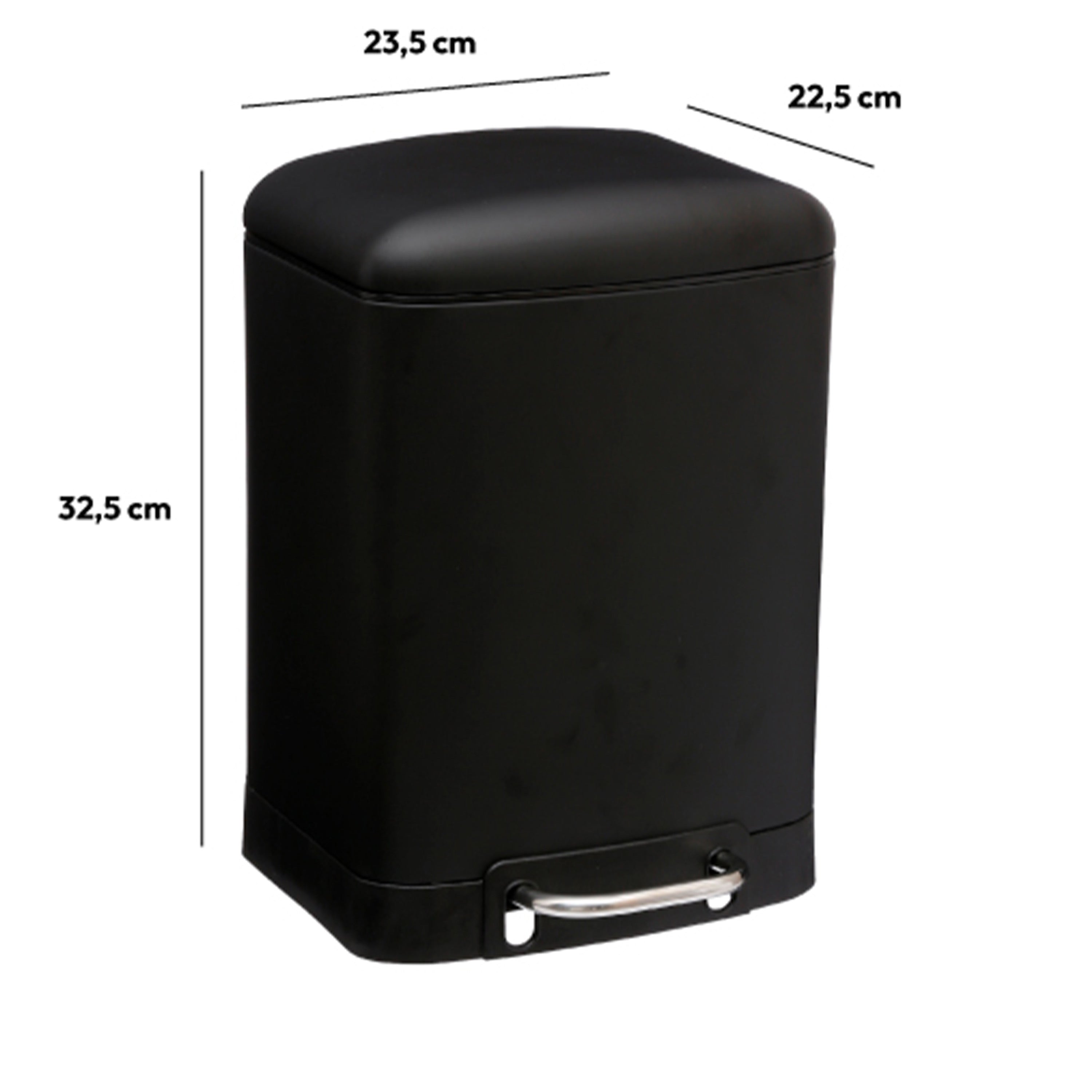Prullenbak/pedaalemmer in een mooie kleur zwart, gemaakt van rvs metaal en een inhoud van 6 liter. Geschikt voor in de toilet en badkamer. Afmetingen: 23 x 22 x 32 cm. Sluiting is met het soft close principe. Model: Ariane. De pedaalemmer heeft een uitneembare, makkelijk te reinigen binnenbak die voorzien is van een handgreep. Gewicht: 1.2 kilo. Aanbevolen vuilniszak formaat is 10 liter.