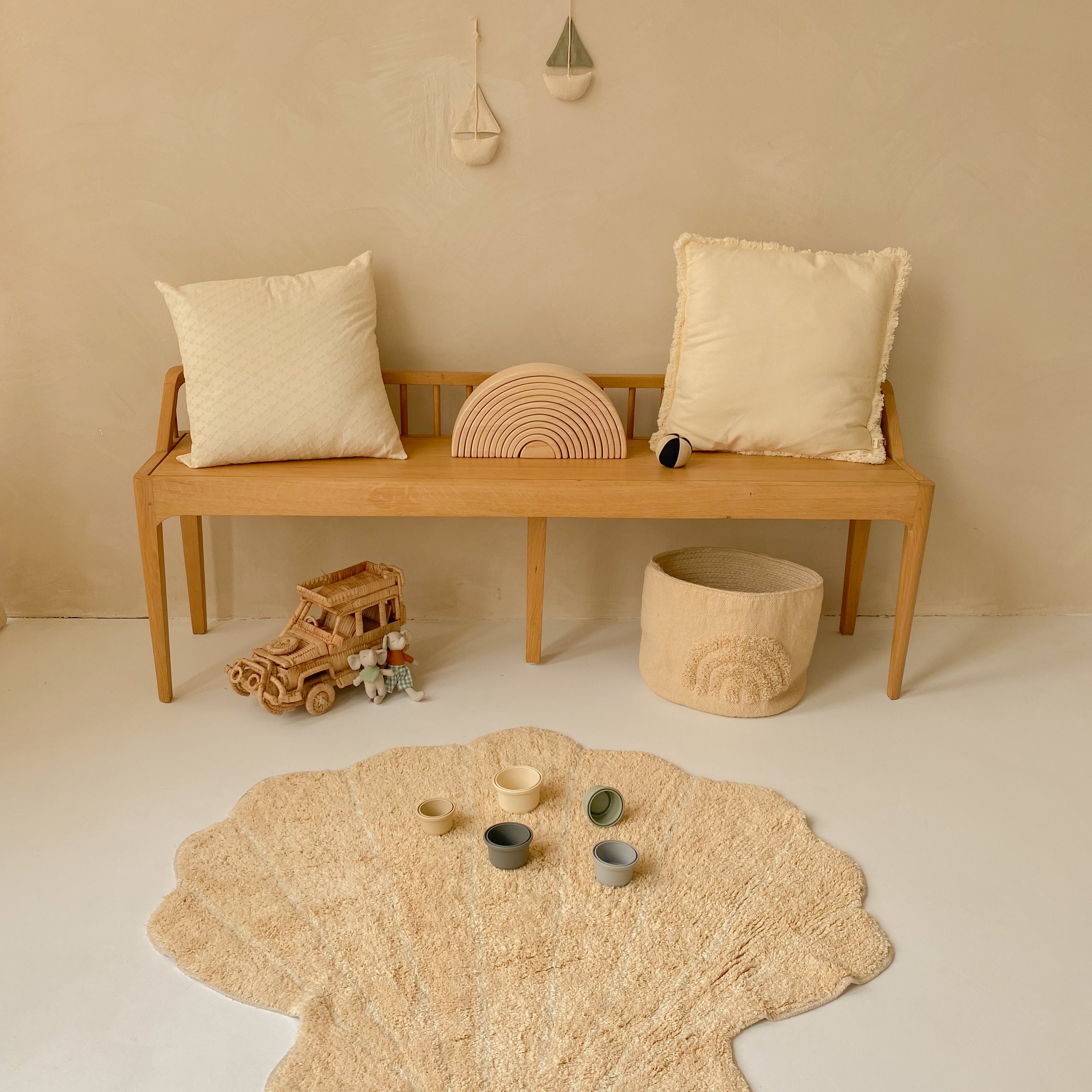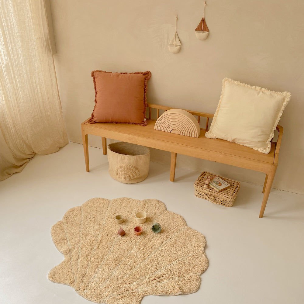 - Het schelpvormige kleed zorgt voor een serene, bohemian sfeer