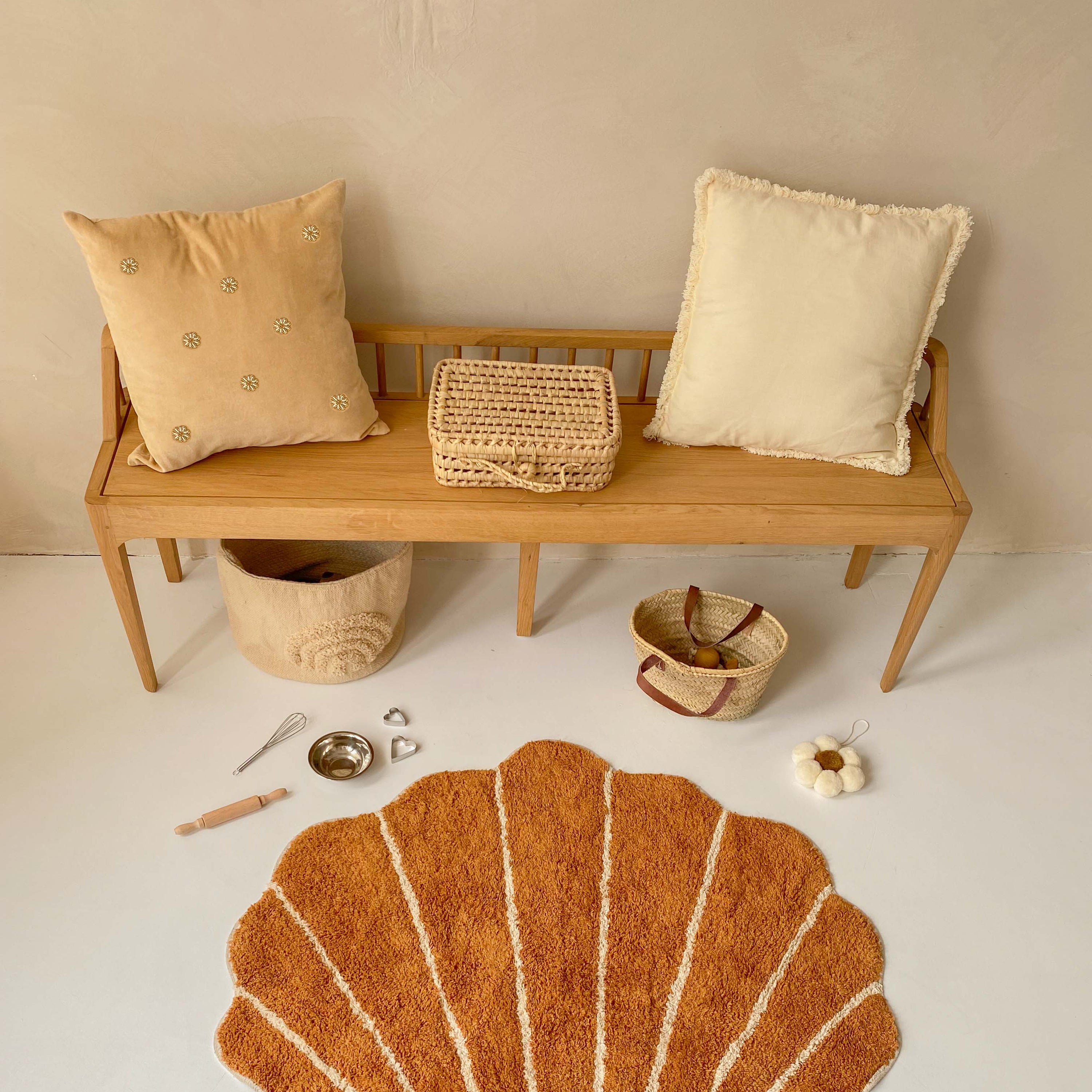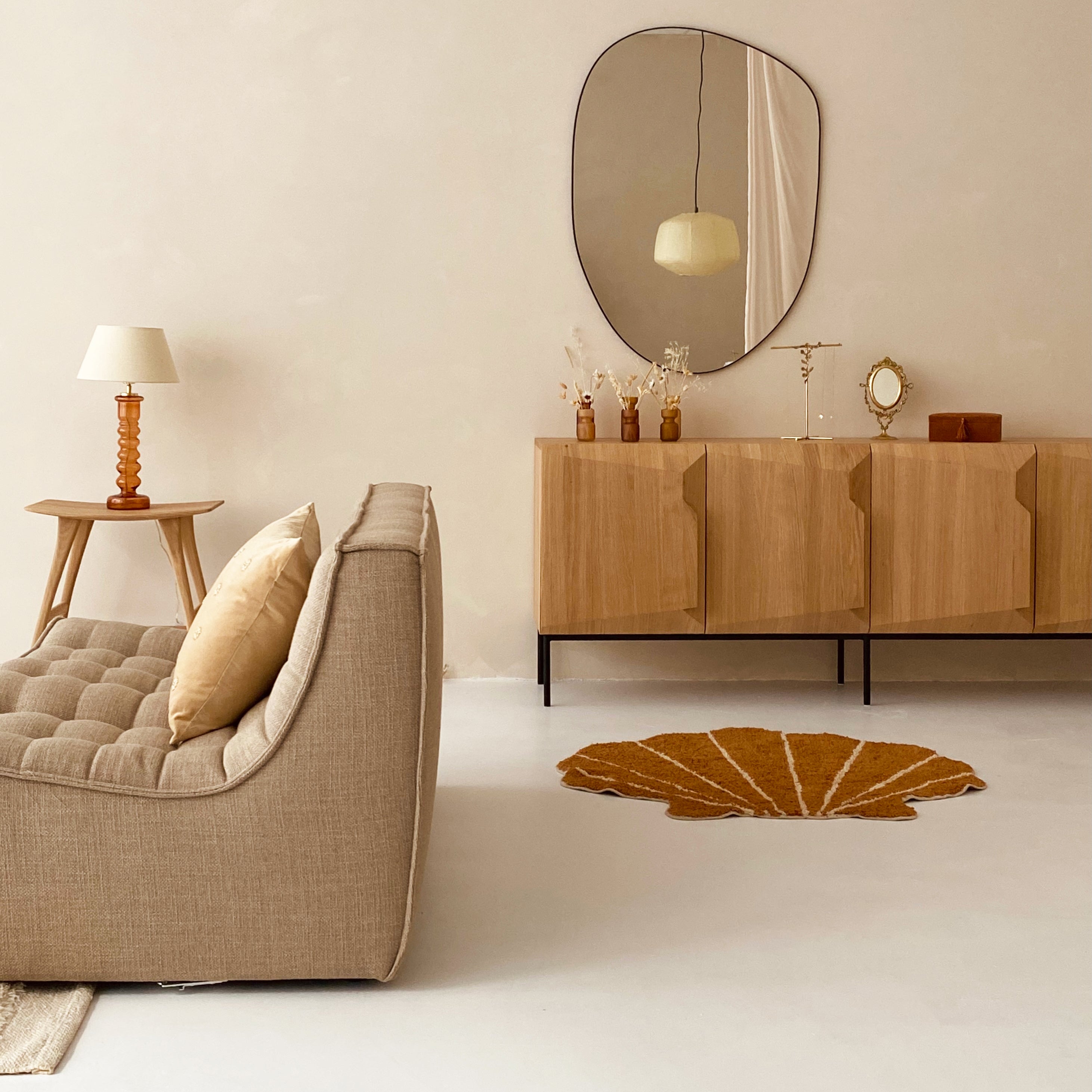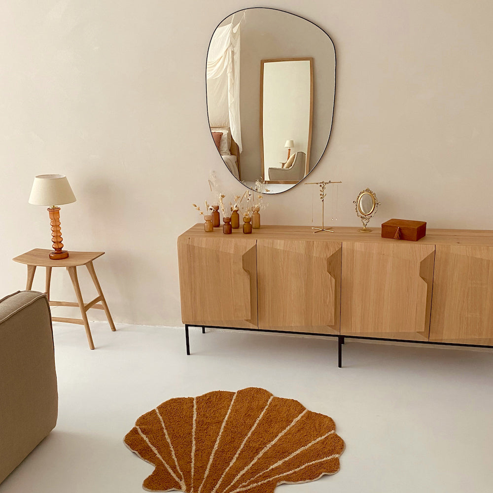 - Het schelpvormige kleed zorgt voor een serene, bohemian sfeer