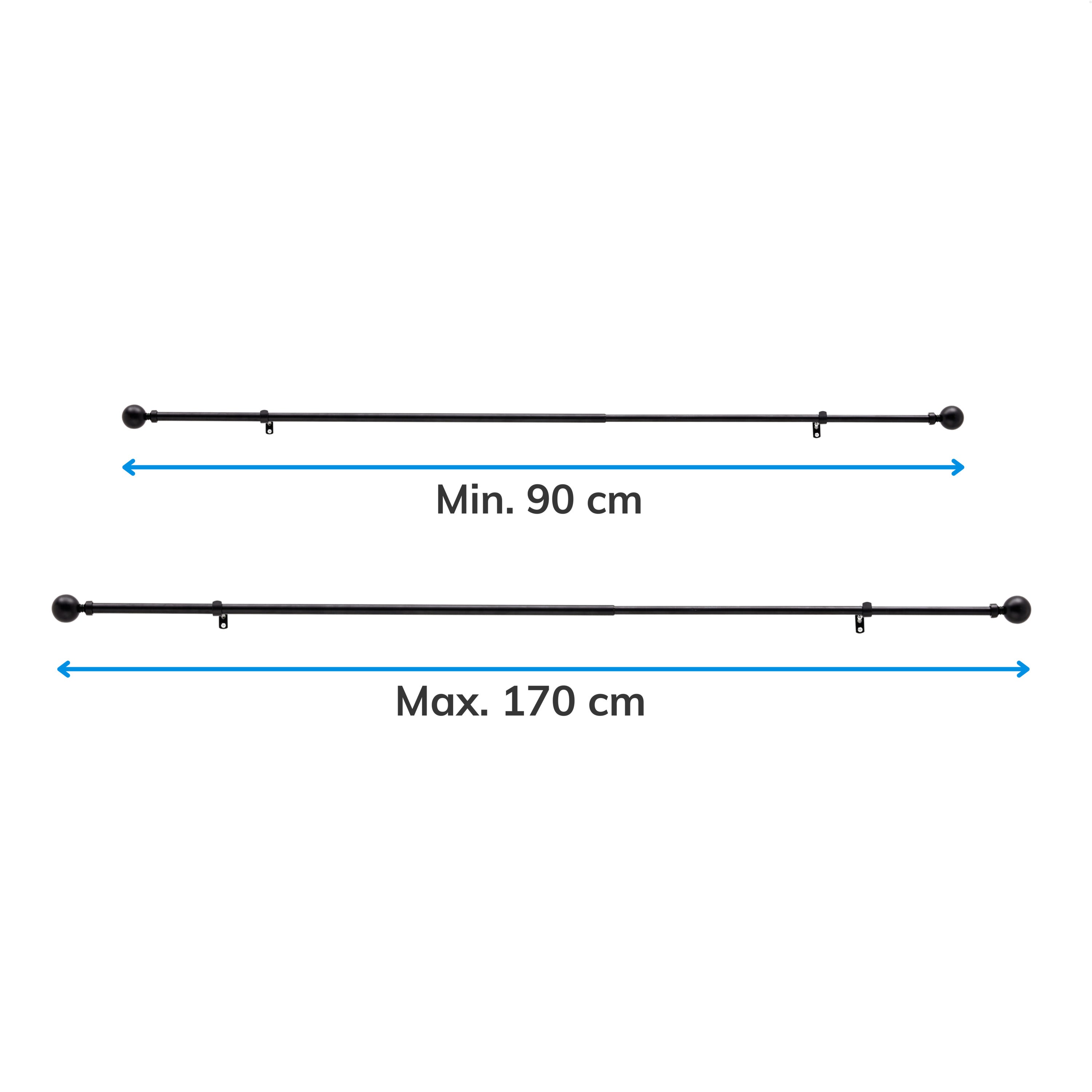 Heb je lastige afmetingen, of verschillende maten van ramen? Dan is deze stevige, uitschuifbare rail perfect voor jou!Je kan hem gemakkelijk aanpassen naar de lengte die je verkiest vanaf minimum 90cm tot maximaal 170 cm. Dit maakt het een flexibel en gemakkelijk systeem dat iedereen gemakkelijk kan gebruiken zonder technisch aangelegd te zijn.Gordijnen zorgen voor sfeer en verbeteren bovendien de akoestiek van je ruimte. Door het universele design kan deze gordijnroede in iedere kamer in huis opgehangen worden. Voor de bevestiging aan de muur moet geen materiaal voorzien worden, de vijzen en plugs worden meegeleverd.Eigenschappen:- Merk: ACAZA- Kleur: Zwart- Afmetingen: 90-170 cm, Ø16-19 mm- Materiaal: Roestvrij staal