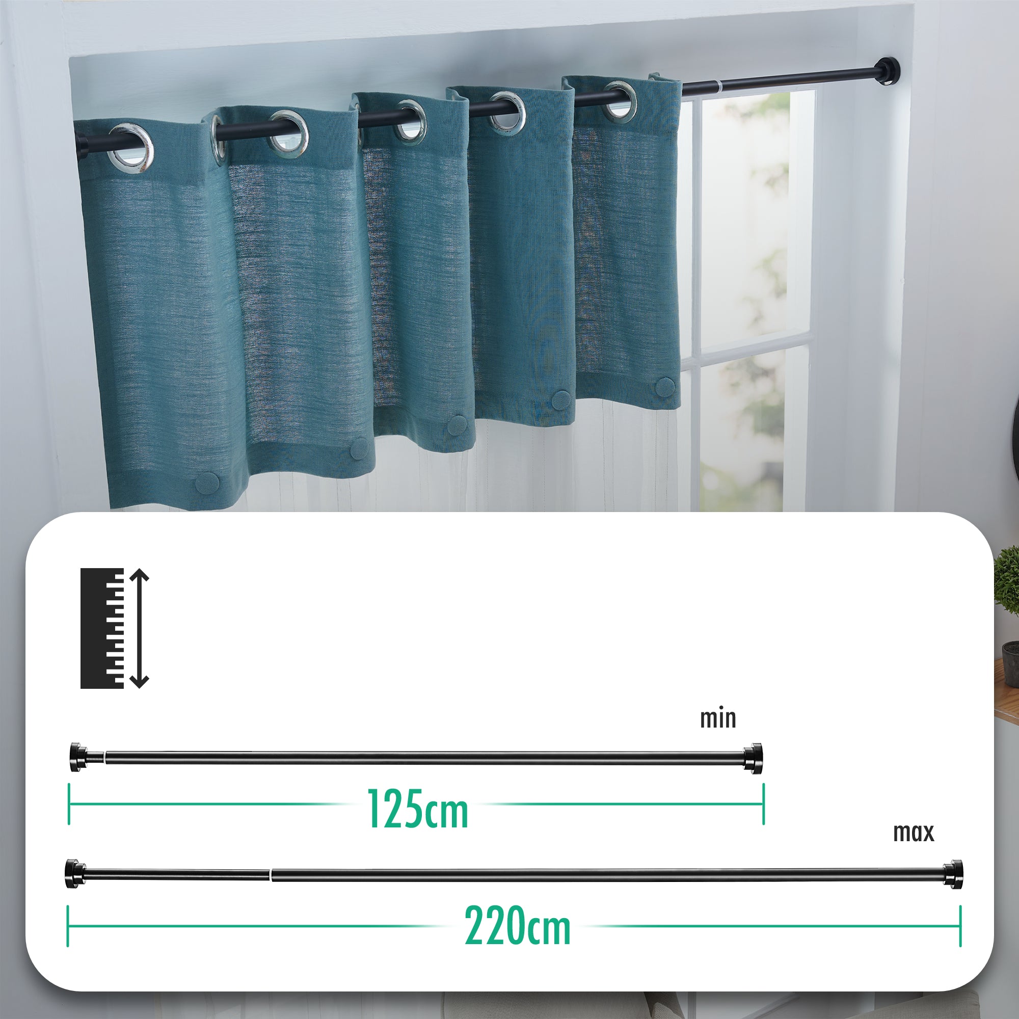 Deze gordijnroede werkt met een zelf opspannend systeem, waardoor u geen gaten hoeft te boren in uw muren. de rail kan aanpassen aan de lengte van uw ramen. De roede heeft een aanpasbare lengte van 125-220 cm en een diameter van 16 mm. Het is gemaakt van roestvrij staal en is zilverkleurig. Eigenschappen:- Kleur: Zilver- Afmetingen: 125-220 cm, Ø16;19 mm- Materiaal: Roestvrij staal- Bevestiging: Zelf opspannend