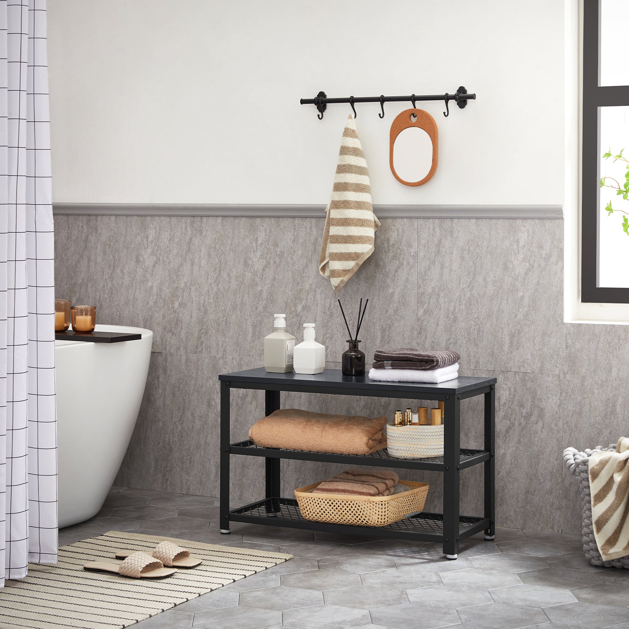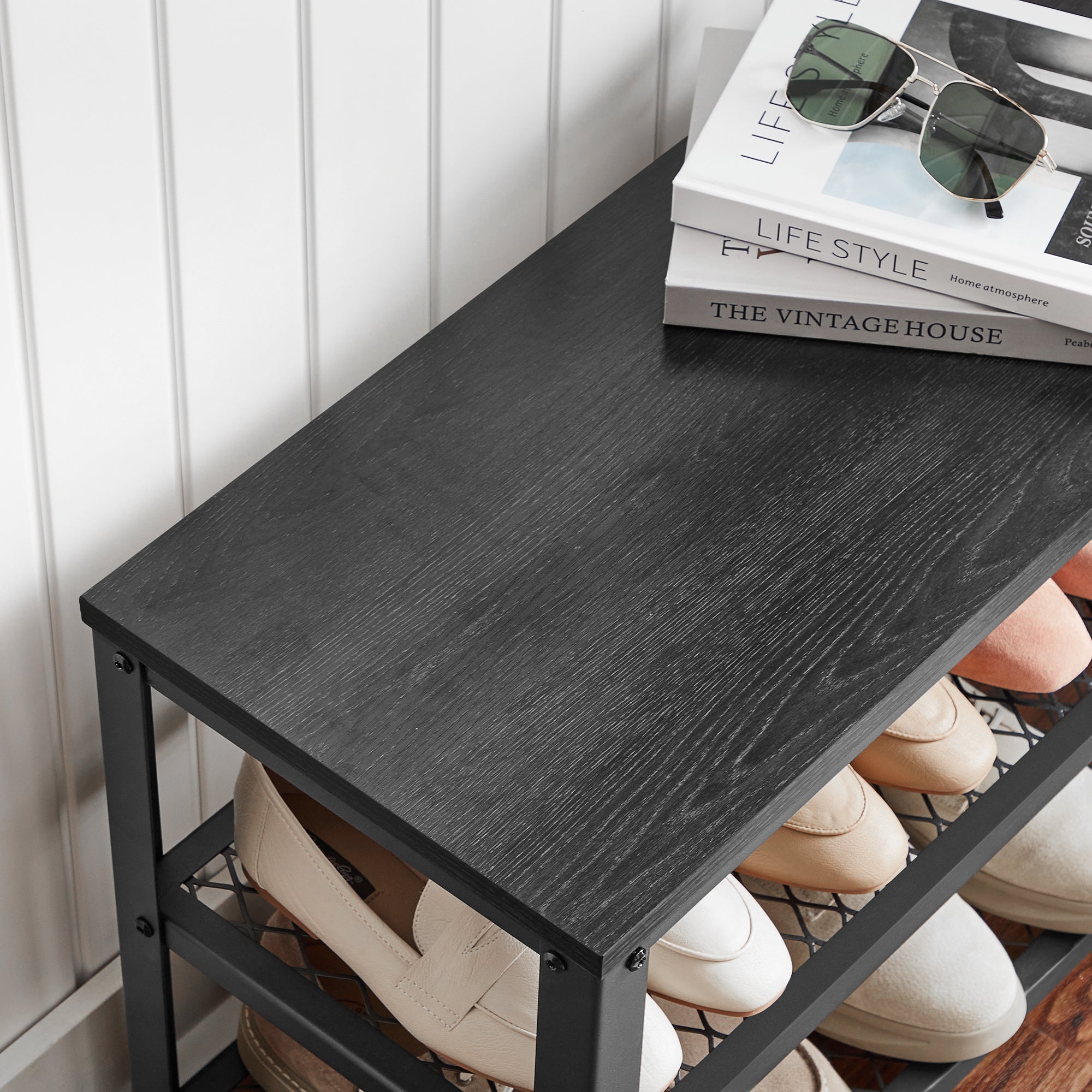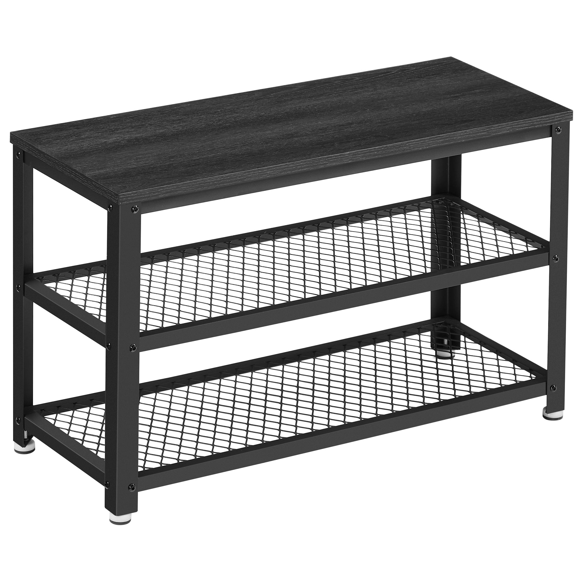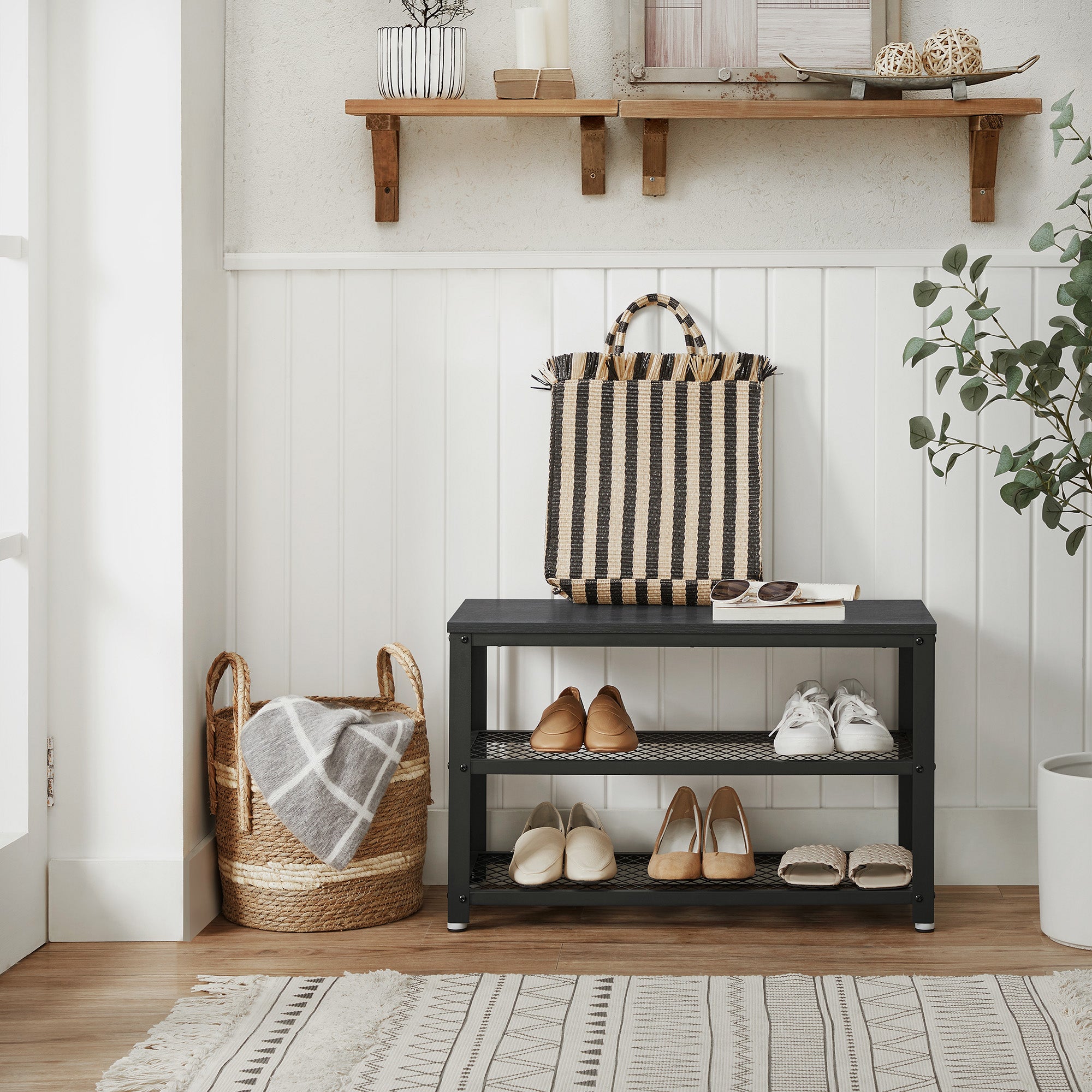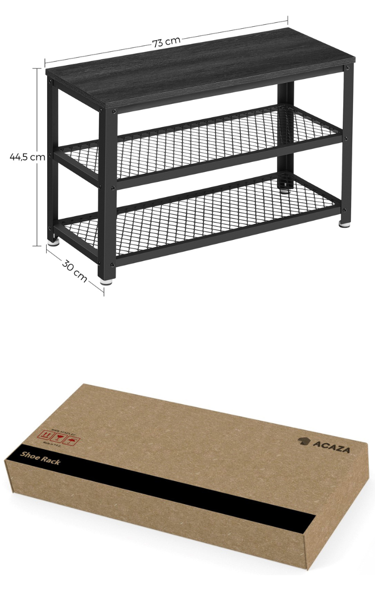 Loopt er ook een sloddervosje bij u thuis rond? Dit elegante schoenenrek van ACAZA is de oplossing!Functioneel en stijlvolDit opbergrek heeft 3 niveaus en neemt weinig ruimte in beslag. Het rekje biedt toch een grote capaciteit om je schoenen op te bergen en aan te trekken. De zwarte kleur van het houten blad en het metalen frame zal een strak moderne toets geven aan uw inkomhal, entree of slaapkamer. HandigDit schoenrek met bankje heeft 4 voetjes die voor een goede stabiliteit zorgen, zelfs op een licht oneffen ondergrond. Ze beschermen de vloer ook tegen krassen. Met een draagvermogen van 90 kg kan je rustig je sneakers of andere schoenen aantrekken.Kenmerken:- Kleur: zwart- Materialen: spaanplaat, ijzeren frame- Afmetingen: 73 cm lengte, 30 cm diepte, 45 cm hoogte- Gewicht: 8 kg- Maximale belasting: 90 kgInhoud van pakket- Schoenenrekje- 1 x zak met accessoires- 1 x montagehandleiding (FR, NL, DE, EN, ES, IT)Voorzorgsmaatregelen:- Gebruik deze schoenenbank niet in een vochtige omgeving.- Overschrijd de maximale belasting van het product niet.