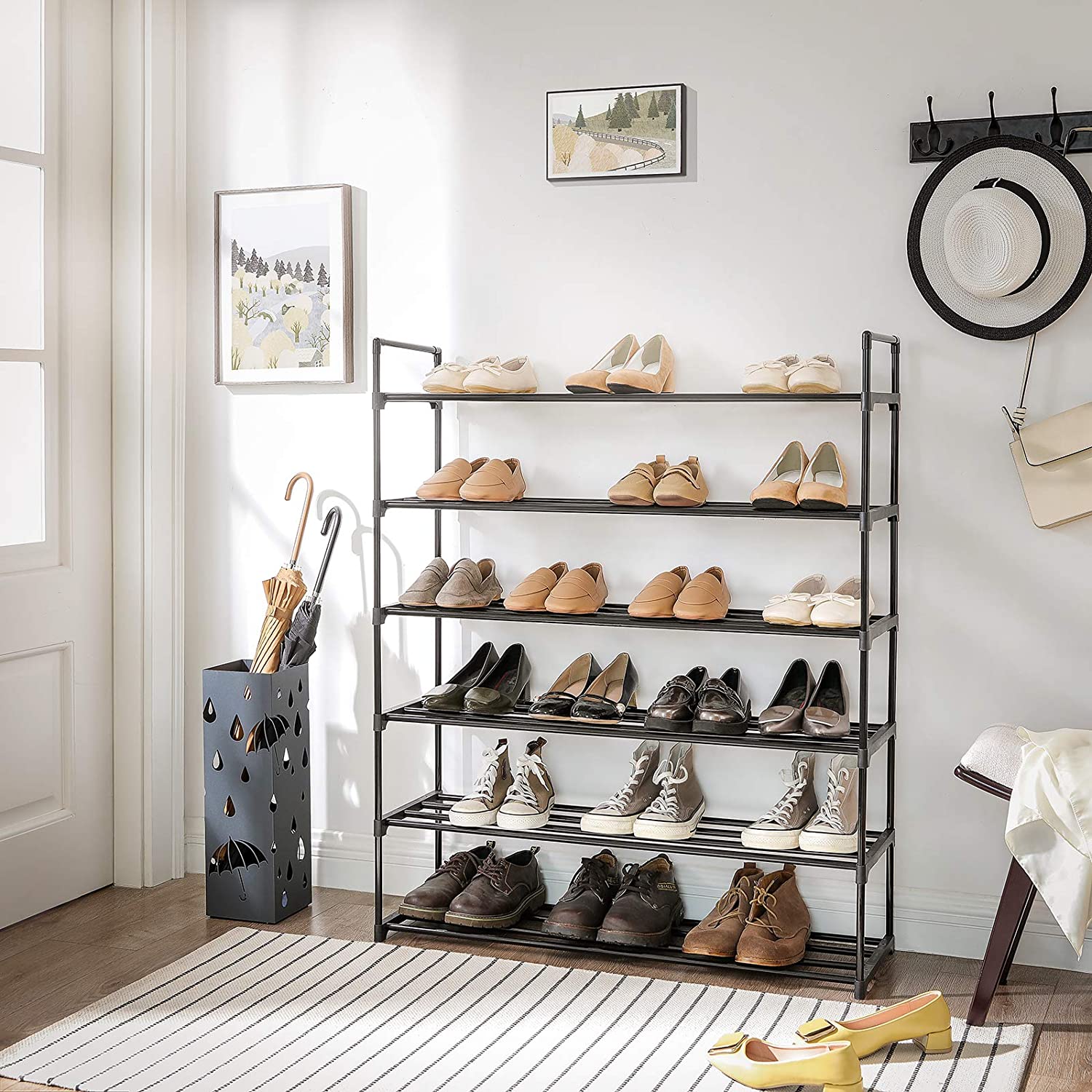 Heeft u ook zoveel schoenen? En droomt u van netjes naast elkaar geplaatste schoenen? Dan maakt deze set van 2 schoenenrekken uw droom waar! Ze bieden plaats voor zo'n 24 paar schoenen en zijn hierdoor dus zeer praktisch. Heeft u ook enkellaarsjes die u wil opbergen, maar zijn ze iets te hoog? Geen probleem, verwijder dan gewoon een legplank! Super handig, u kan de schoenenrekken apart gebruiken of op elkaar stapelen. Gemaakt van robuuste, metalen buizen met hoogwaardige verbindingsstukken in kunststof, bieden de schoenenrekken een uitstekende stabiliteit.
